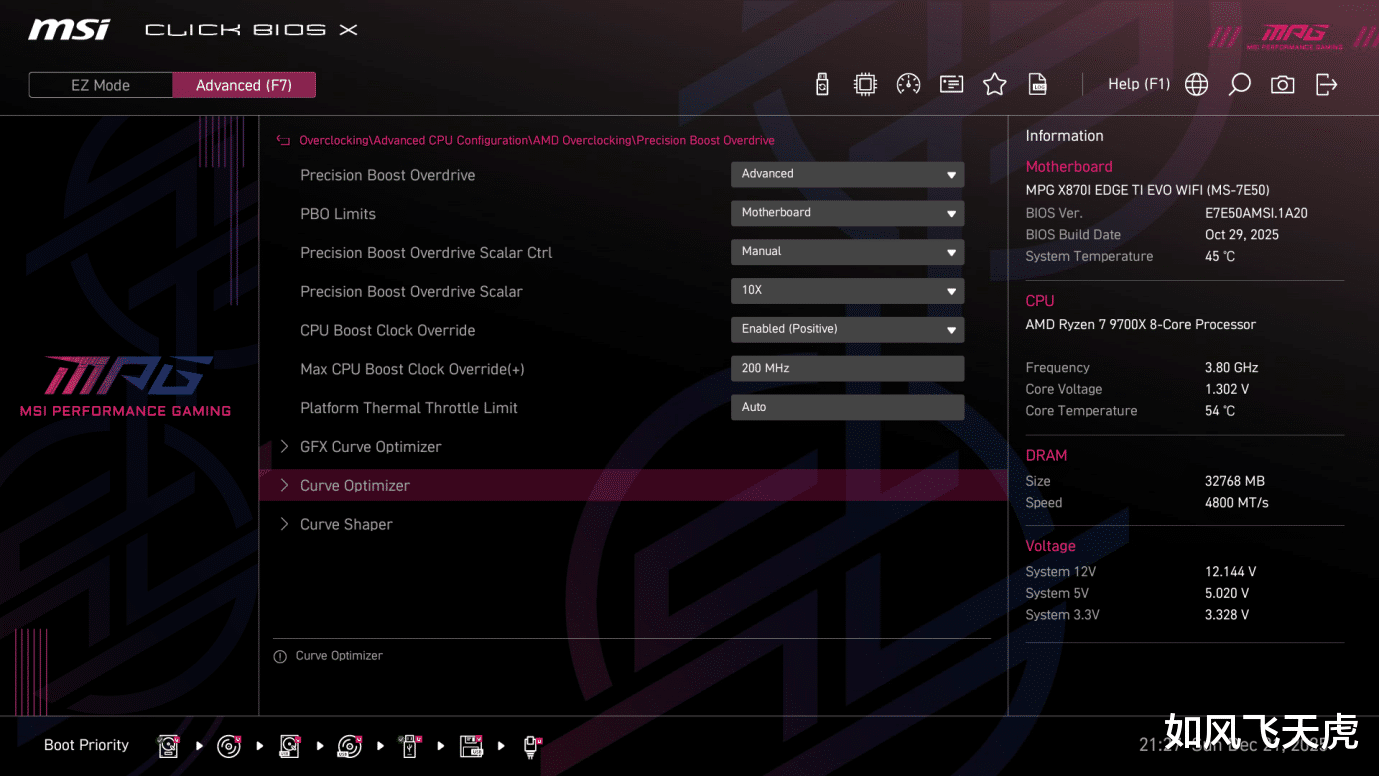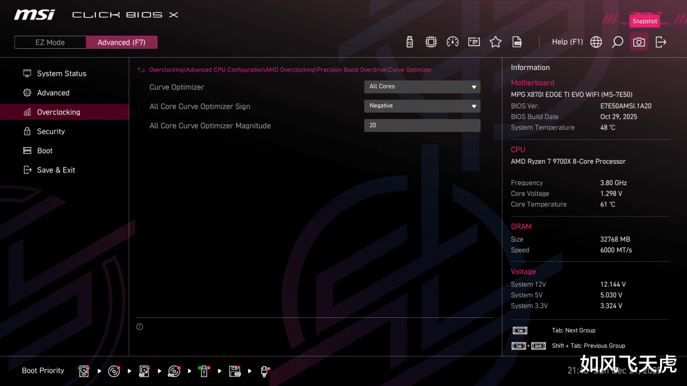 虽然我这块CPU可以支持到负压30没有问题,考虑到安全和留有余地,选择了负压20。然后保存重启电脑。