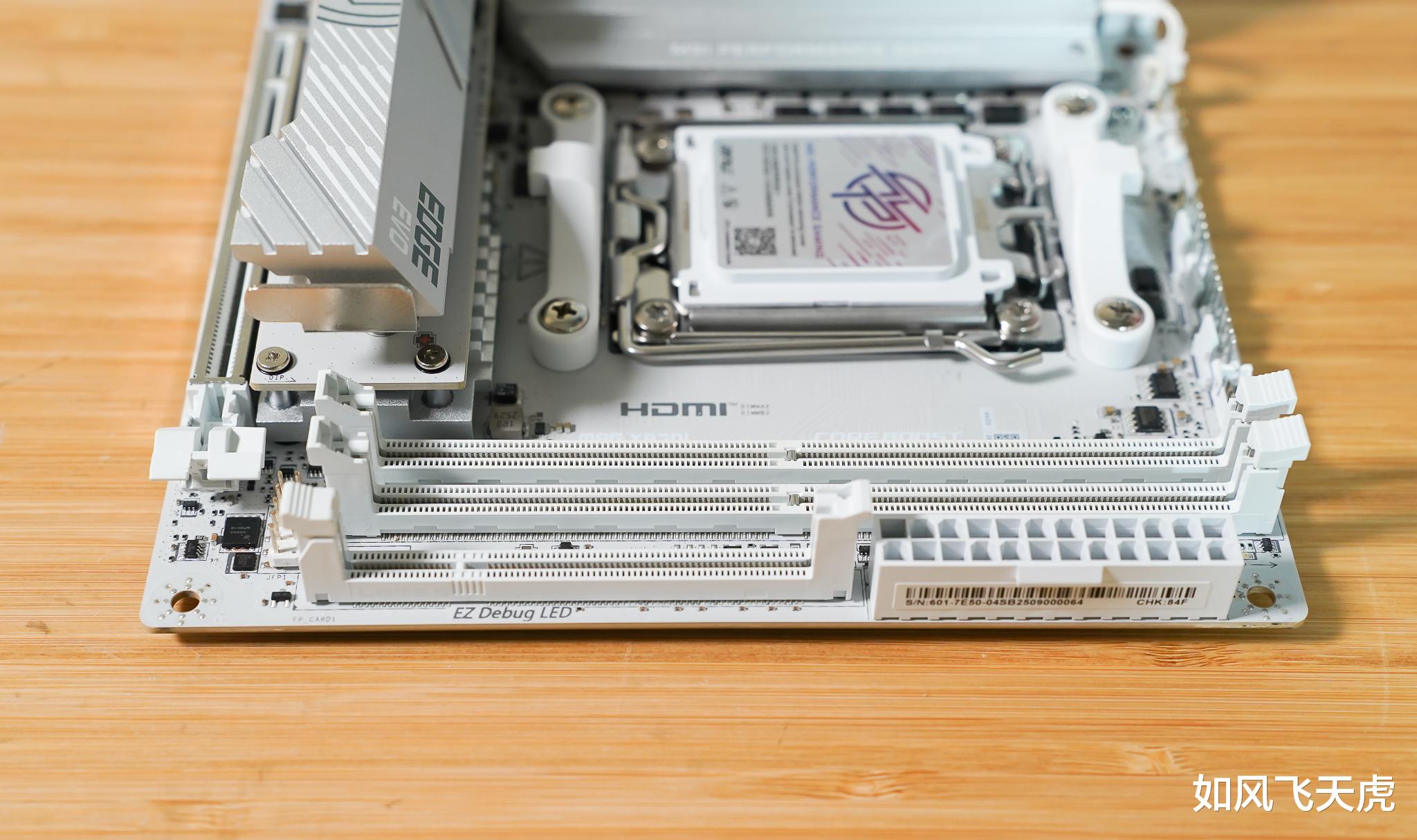 主板配备双DDR5内存插槽,支持EXPO/XMP 3.0协议,极限频率可达10000MT/s以上,满足高频内存用户对性能的追求。边上是主板24PIN供电接口,边上一个短插槽则是扩展槽,可以接驳配件里的5合1XPANDER扩展卡。