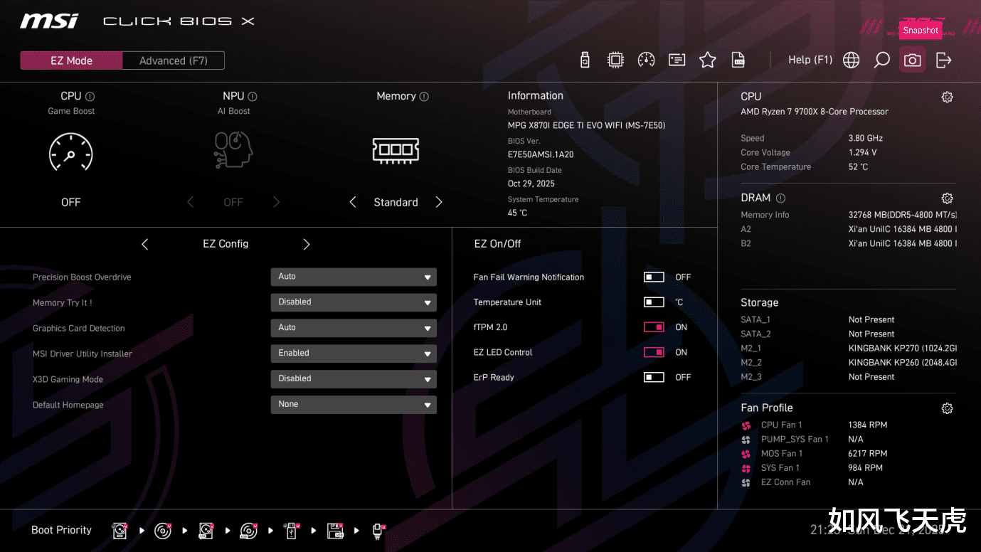 这款主板采用了110A 8+2+1相供电,12层服务器级PCB板,稳定支持高功耗处理器。设计上支持PCIe 5.0 ,支持DDR5内存最高超频到10000+MT/s,带有 Wi-Fi 7 + USB4 全接口覆盖。同时包括5合1扩展卡、EZ转接线在内的多种扩展,实现接近ATX主板的接口能力。CLICK BIOS X 界面兼具易用性与可调性,可以实现CPU和内存轻松超频。散热设计优化,满载运行稳定可靠。对于追求高集成度、高性能、高扩展性的用户而言,这款主板提供了完美适配的ITX解决方案。