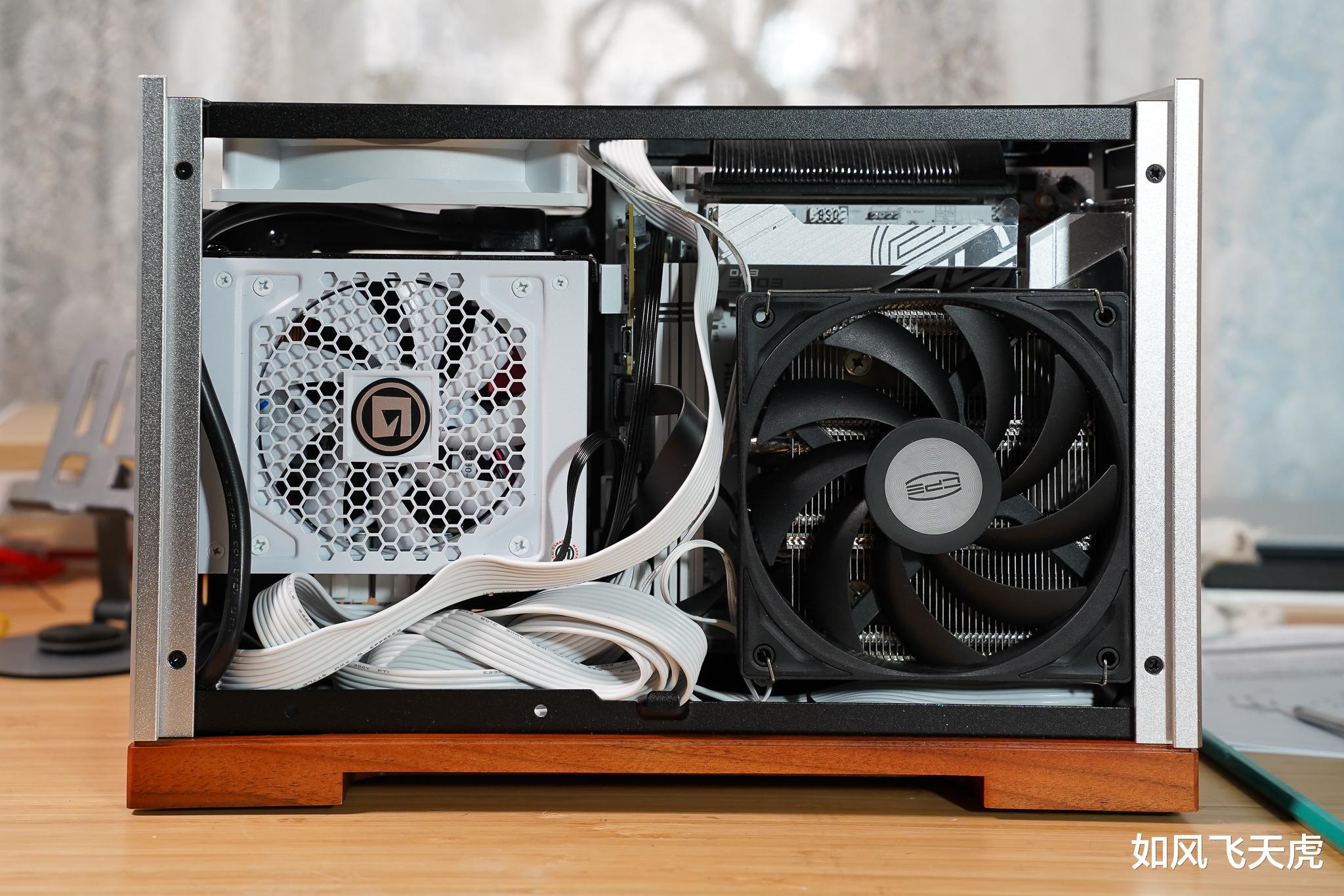 装好之后的样子,ITX如果不是用定制线就不要纠结整齐度了,反正盖上看不见。散热器是超频三的RC600-67,换个白色的风扇会更搭配一些。本来入手了乔思伯的HP-600。但是它那个在AMD平台有点问题,所以换了这个。电源是艾湃电竞的KR-850MW白金认证电源。这里还要注意下,扩展卡出来的SATA接口,被机箱的电源支架挡住了,所以这个机箱,基本上还是适配普通版的ITX主板。