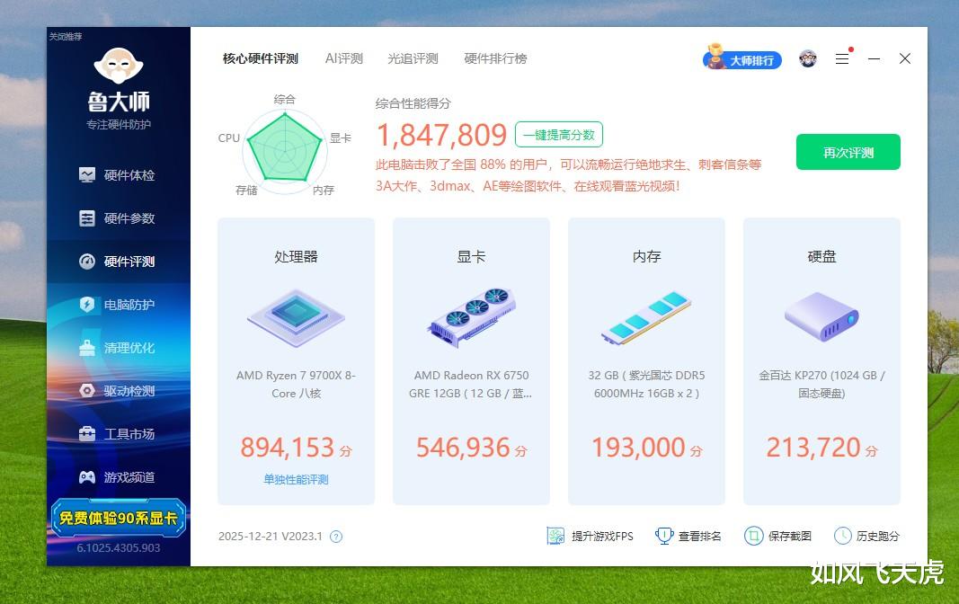 鲁大师测试,总分184.7809万分,其中CPU89.4153万,内存19.3万分。