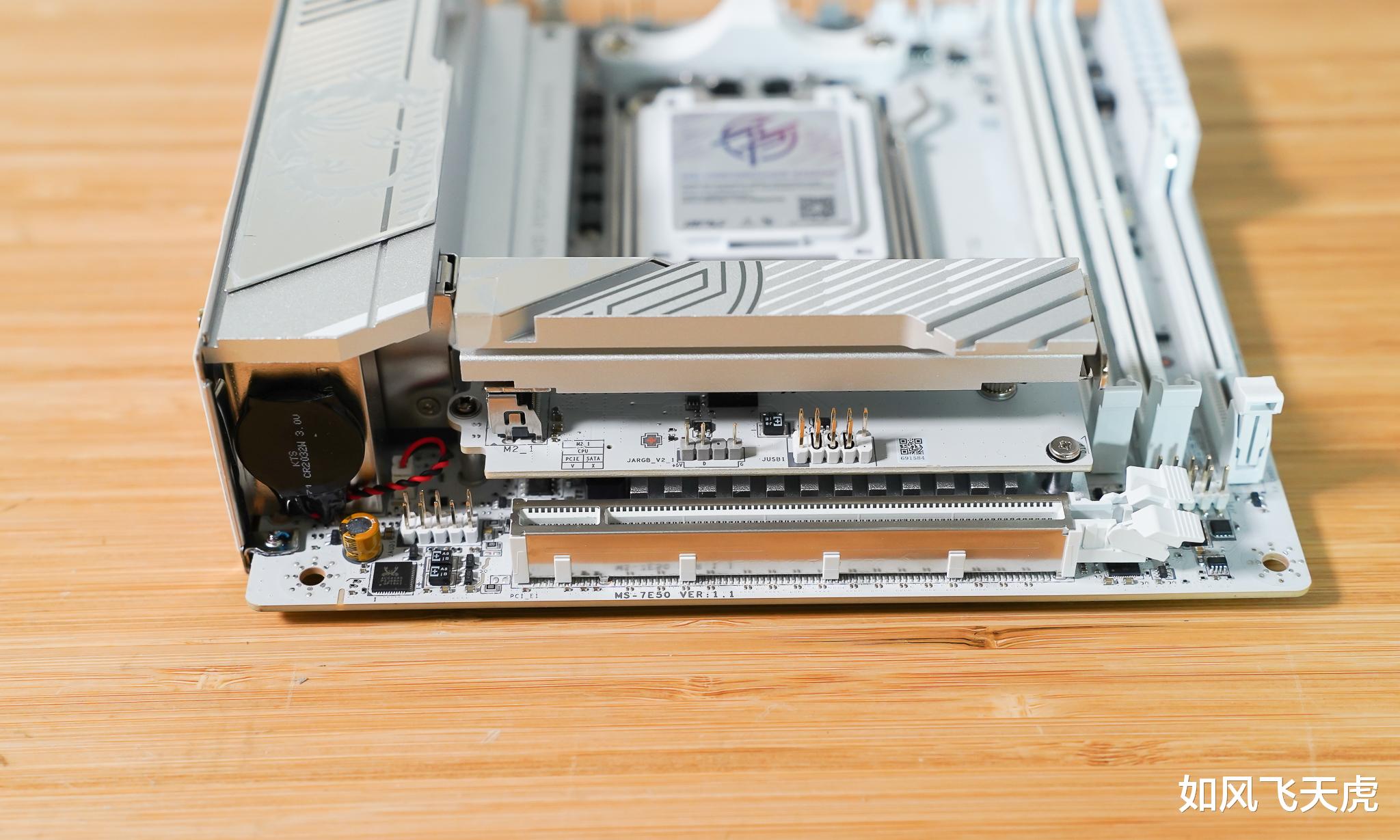 可以看到主板的供电区域配备大面积金属散热片,配有7W/mK MOSFET导热垫,还配备独立小风扇,可智能启停,在高负载时自动提速,有效抑制温升,保障长时间稳定运行。在主板的顶部有CPU供电接口,采用8PIN实心供电设计。这一边还有众多的接口,包括有2个风扇接口和一个水泵接口,通常来说ITX主板只有2个风扇接口,而微星的这款主板将接口扩展到标准主板的水平。不仅如此,左侧还有一个微星EZ转接接口,通过配件里的转接线,可以转出一个ARGB接口、一个风扇接口和一个USB2.0接口。这里还有一个机箱入侵探测接口,如果有需要的话可以安装。