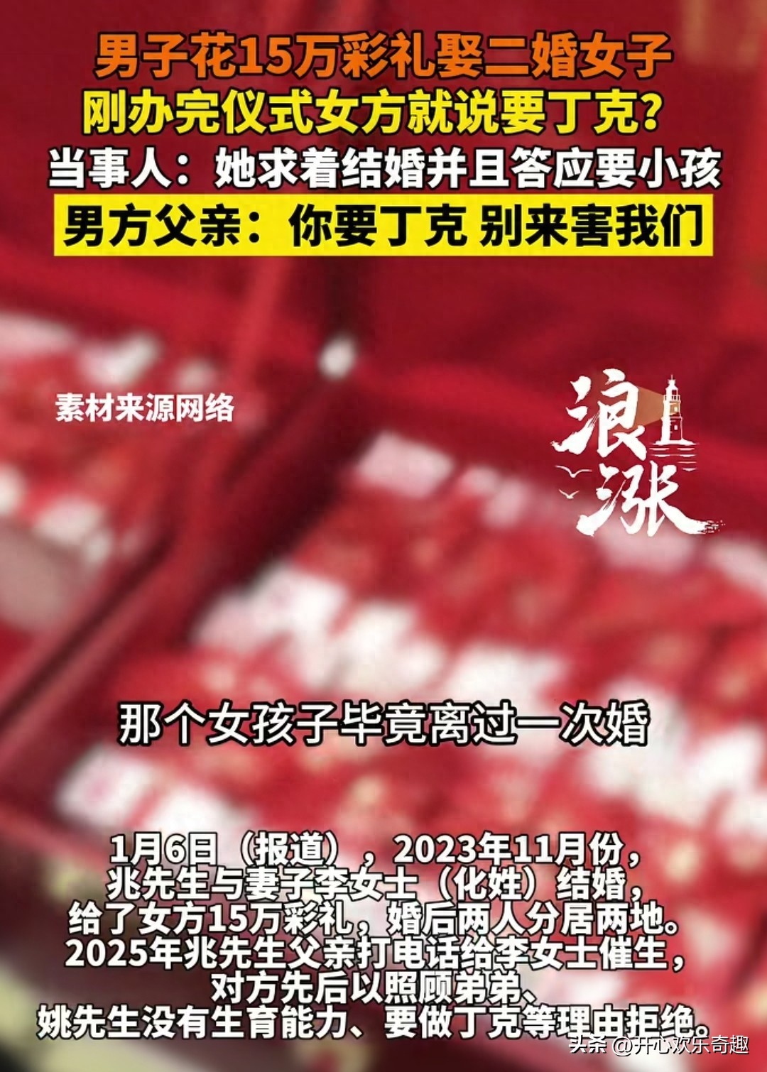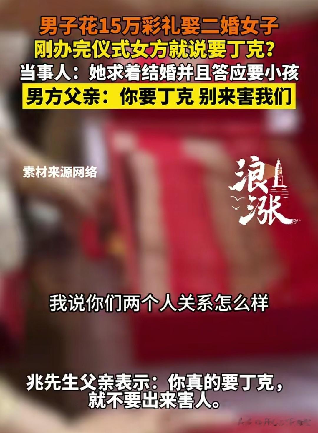 是那个女的不孕不育吗?因为毕竟她已经离过一次婚了,可能之前就已经查出他已经是不孕不育的?因此她现在找借口说自己要丁克,而且把那15万的彩礼拿到手之后,就一脚把这个老公踢走?