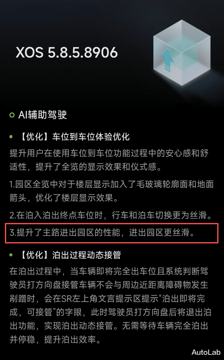 但是在我们本期视频即将发布之时,小鹏给用户推送的5.8.5版本中提到:提升了主路进出园区的性能,进出园区更丝滑。
