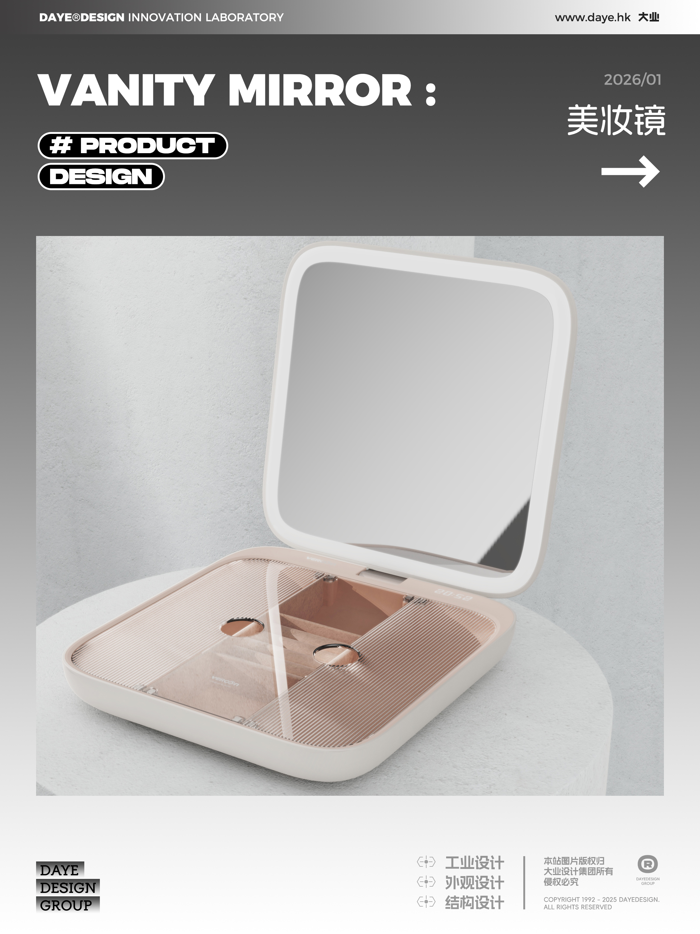 整体遵循折叠盒型的一体化造型:闭合时是规整的方形收纳盒,适配梳妆台的空间整洁需求;展开后是镜体 + 收纳仓的组合结构,既满足化妆时的镜面需求,又能收纳小饰品、美妆工具,实现化妆 - 收纳的场景闭环;圆角设计既消解了盒型的生硬感,又契合美妆场景的柔感美学 。