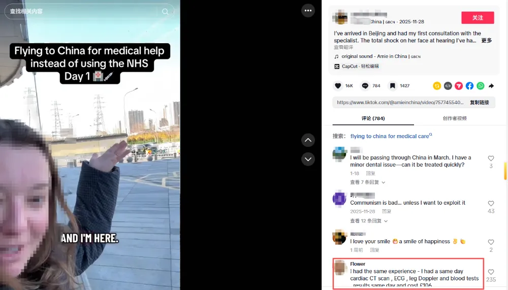 视频下方的网友也纷纷留言类似经历,买张机票飞到中国,当天就挂上号,抽血、CT、心电图……当天检查就出了结果,只花了106英镑(约合人民币1016元)。