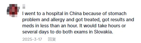 一位斯洛伐克网友分享:“在中国,从挂号、检查到取药,一小时内全部完成。而在我国,完成同样的流程需要数小时甚至数天。”