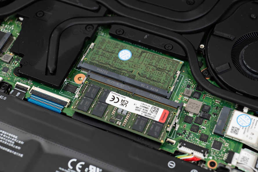 两根内存插槽,预装了一对金士顿DDR5 SO-DIMM内存,组成32GB 5600Mhz双通道规格。