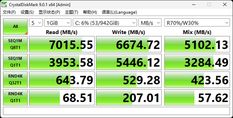 使用最主流的硬盘跑分软件CrystalDiskMark进行测试,PC42Q 1TB在Q8T1的顺序读写中可达到7015.55 MB/s的读取速度,6674.72 MB/s写入速度,在70%读和30%写的混合模式下也可以达到5102.13 MB/s的优秀表现。随机4K的Q1T1读写速度分别为68.51 MB/s,207.01 MB/s,混合模式下为57.62 MB/s的成绩,对于更加偏向日常的单任务随机读写和程序响应性上来说也是个非常不错的成绩。
