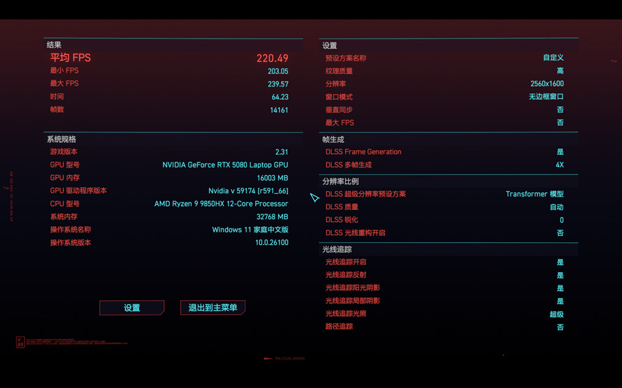 但好在RTX 5080 Laptop支持最新的AI多帧生成技术,我们在打开4x帧生成后,平均帧暴涨到220.49,可以说是画面党的超级神助攻,流畅和画面,我全都要!