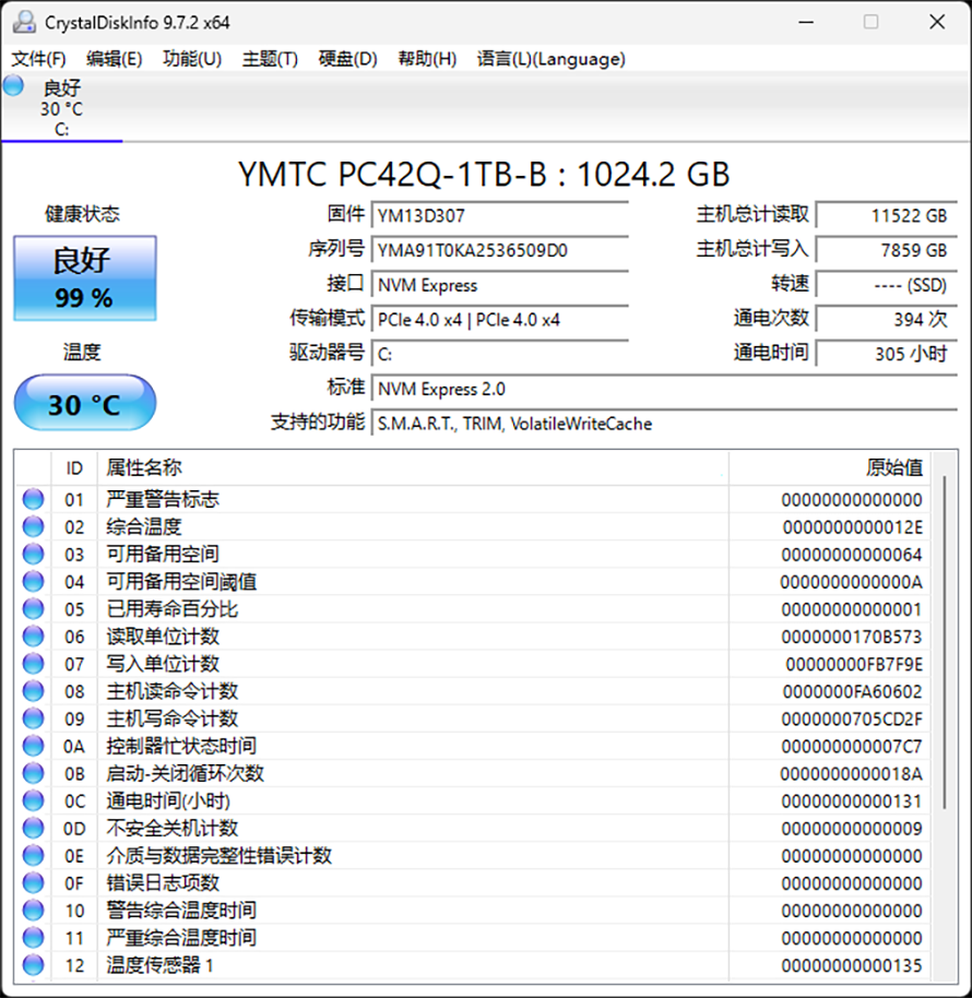 使用CrystalDiskInfo监测,可以看到PC42Q采用PCIe 4.0 x4传输标准,待机温度仅仅只有30度。