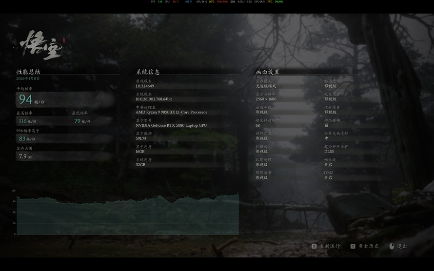 在开启帧生成后,平均帧来到了94帧,提升很大。