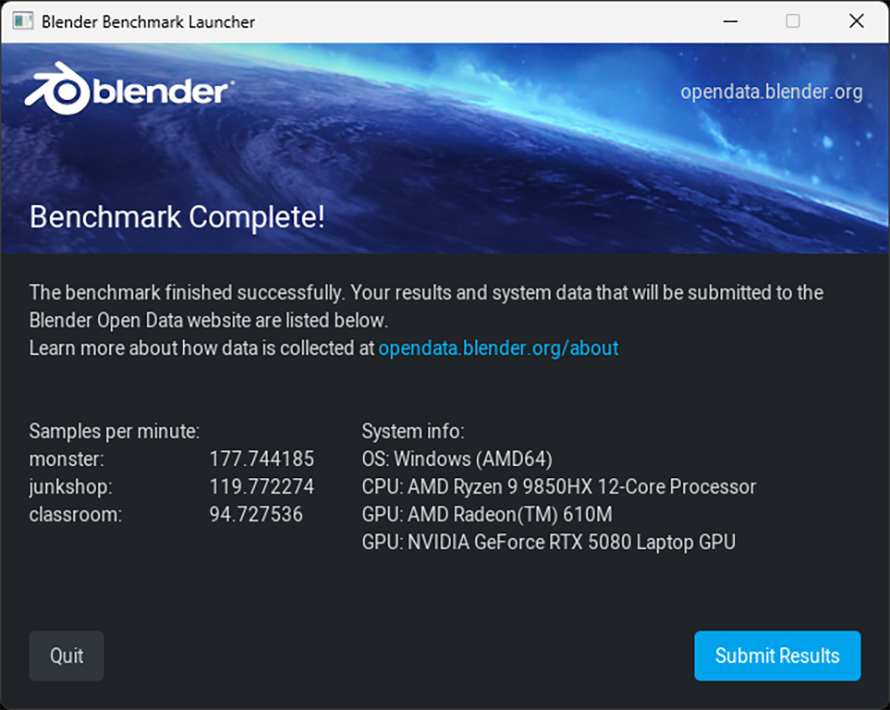 3D渲染类Blender基准测试,实测9850HX在monster中成绩为177.744185,junkshop中成绩为119.772274,classroom中成绩为94.727536。