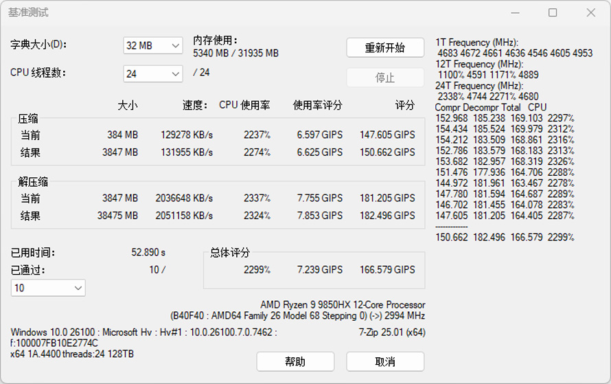 7-Zip测试,对CPU和内存的综合带宽都有较大的压力需求。实测压缩速度能够达到131955 KB/s,解压缩速度可以达到2051158 KB/s。总体评分166.579 GIPS,运行10轮的时间为52.890秒。