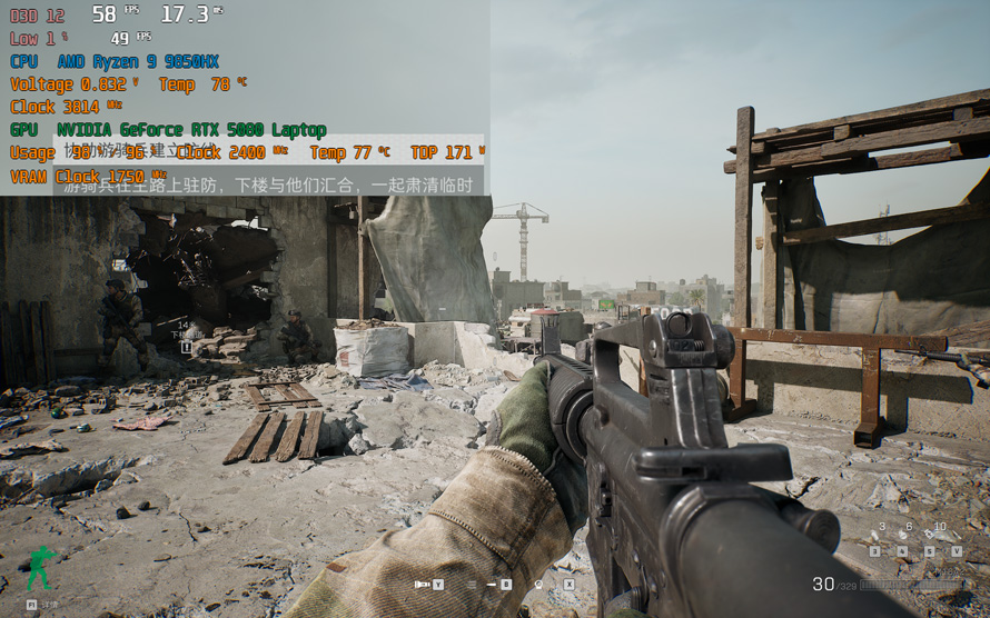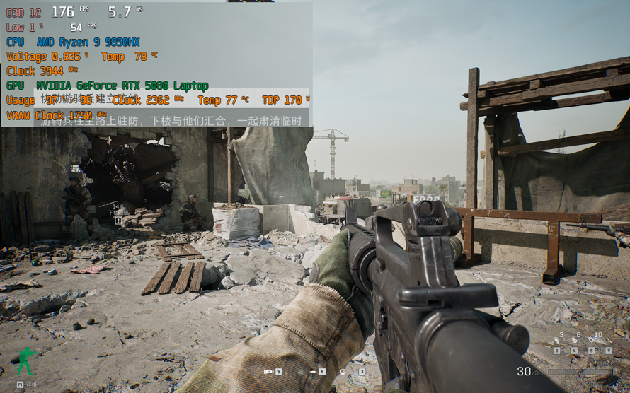 第二款游戏为最近颇为火热的三角洲行动,我们选取了对硬件要求更高,采用虚幻5引擎打造的黑鹰坠落单人行动部分,作为显卡表现的参考。游戏设置为全最高极致特效,分辨率为2560x1600,DLSS级别采用质量优先。