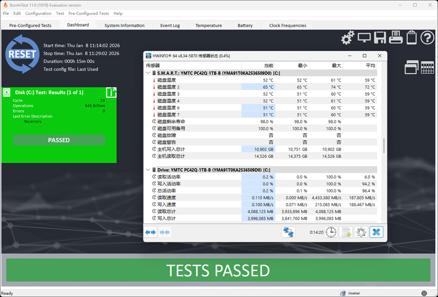 使用了BurnInTest测试SSD压力稳定性,经过15分钟的测试PC42Q 1TB没有出现任何问题。同时检测了压力测试中SSD的发热情况,过程中最高温度不过74/61摄氏度,鉴于此温度还是被封在笔记本内部和没有任何散热片的情况下,都表明这次的PC42Q在温控上确实无敌。