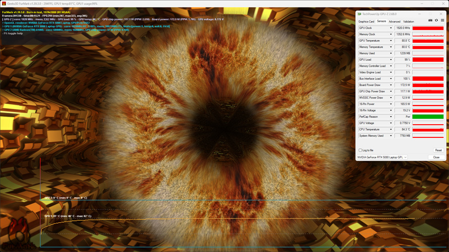 采用Furmark 1.39对GPU进行单烤,设置为1920x1080,noAA。烤机15分钟后,GPU核心温度来到了80.8度,频率保持在1920Mhz,功耗维持在173W上下,也同样符合官方对于175W性能释放的宣发。