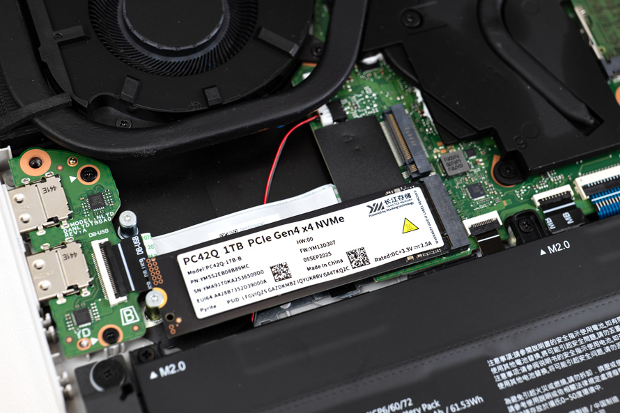 本次的七彩虹COLORFIRE MEOW R16 Pro在硬盘上原厂预装的是长江存储的PC42Q 1TB。该SSD基于长江存储晶栈Xtacking 4.0技术打造的最新一代QLC三维闪存芯片X4-6080,在速度上官宣顺序读写可达到7,000MB/s、6,500MB/s,随机读写也可达到900K IOPS,基本已经与传统的旗舰级TLC闪存SSD在性能上没有差距了。其他方面,PC42Q在功耗上也做了特别的专门优化,工作功耗仅有4W,闲置功耗甚至低于2.5mW。功耗的降低直接影响的就是温度也会同步降低,因此该SSD特别适用于散热条件不利,例如笔记本,掌机等空间狭小没有办法额外增加散热片的设备使用,同时功耗的降低也有助于延长设备的整体电池续航时间。