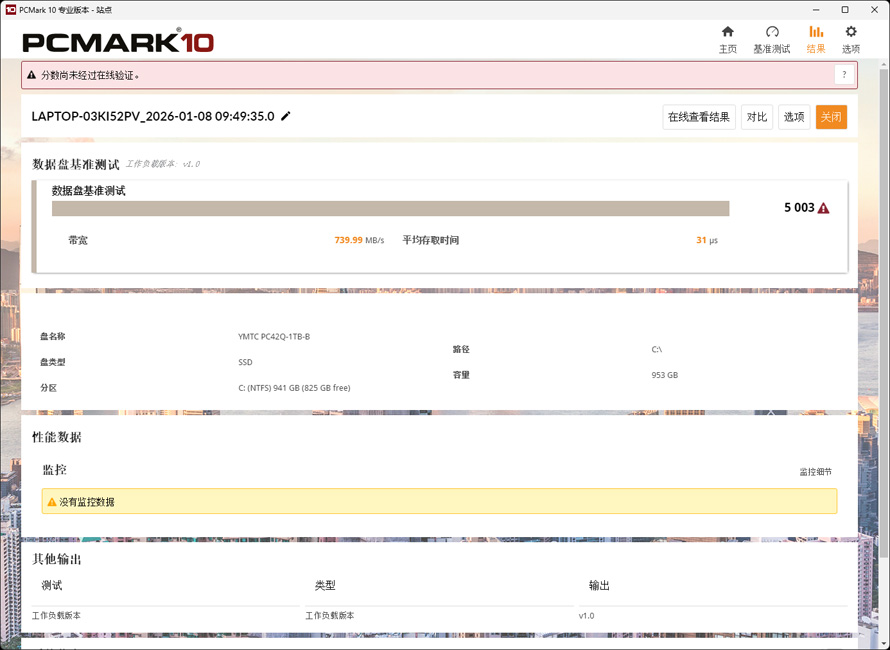 PCMark10数据盘测试,得分为5003,带宽739.99 MB/s,平均存取时间为31 us。