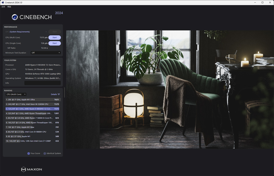 在CineBench 2024中,该CPU多核可获得1575 pts,单核为126 pts.
