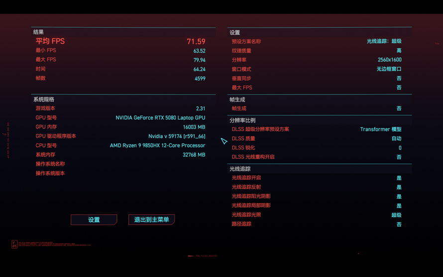 第一款游戏为经典3A大作赛博朋克2077,分辨率设定为2560x1600,画质为光线追踪:超级,打开DLSS 4自动模式,但不启用帧生成,运行游戏自带的基准测试工具,平均帧数达到了71.59。即使是强如RTX 5080 Laptop这种顶级的GPU在这款显卡杀手的面前,原生性能也显得不太够用。