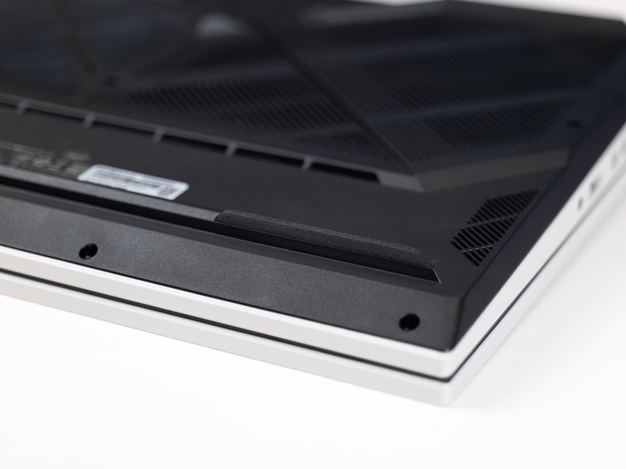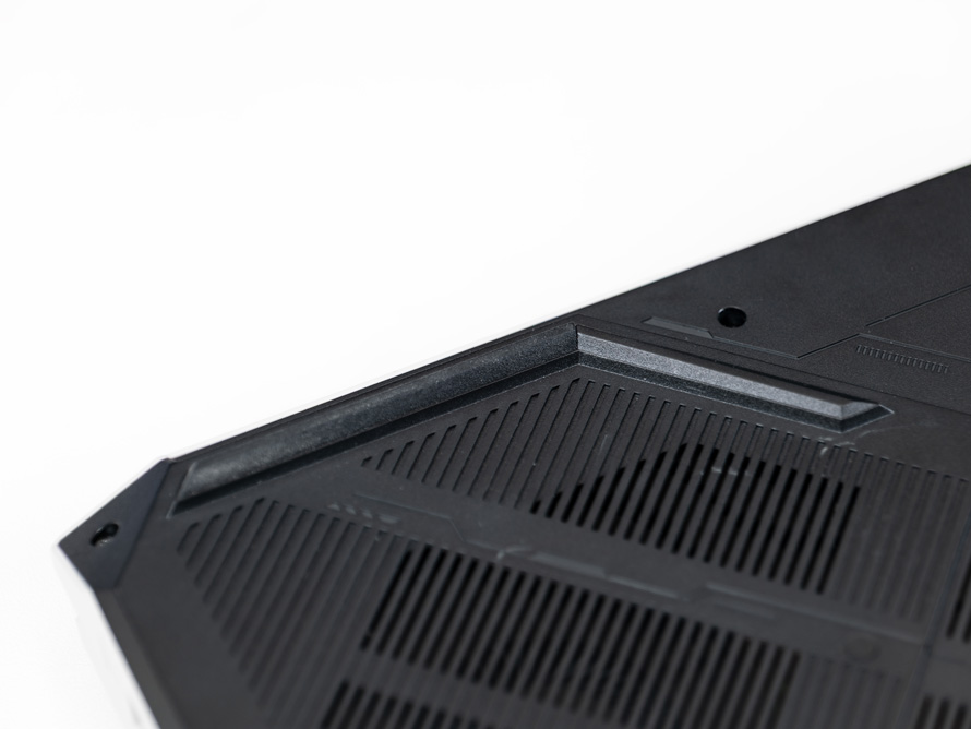 笔记本的D面则是全黑的盖板,整个D面近7成的位置都开有格栅孔,以提高进气和通风性能。