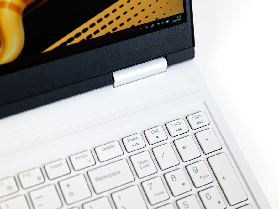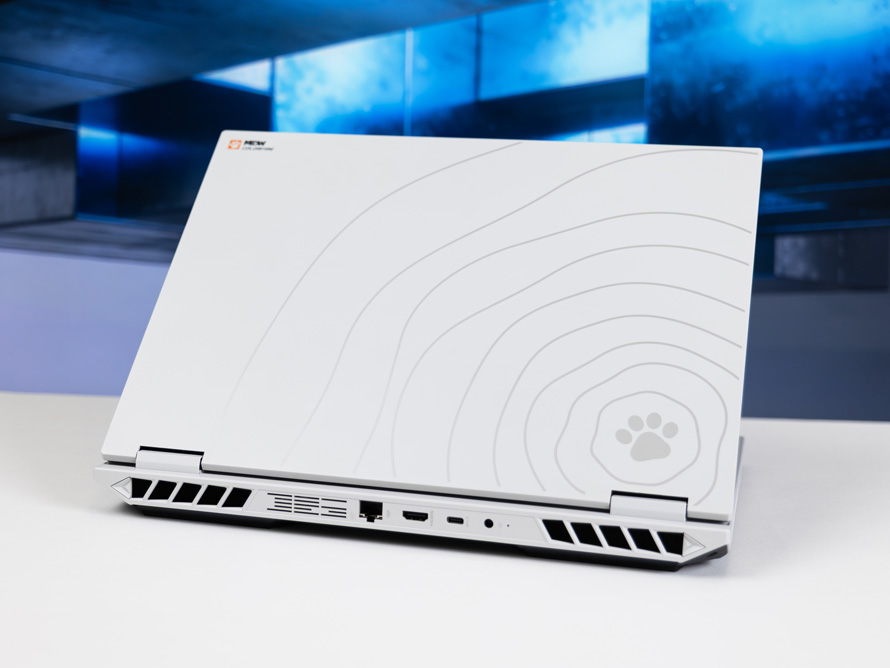 在其他设计方面,MEOW R16 Pro采用的是上置屏轴设计,两个主排风口也设计在了笔记本尾部的左右两侧。这样的设计可以使得出风口完全不会被屏幕遮挡,能让热量更快的从笔记本后部排出。