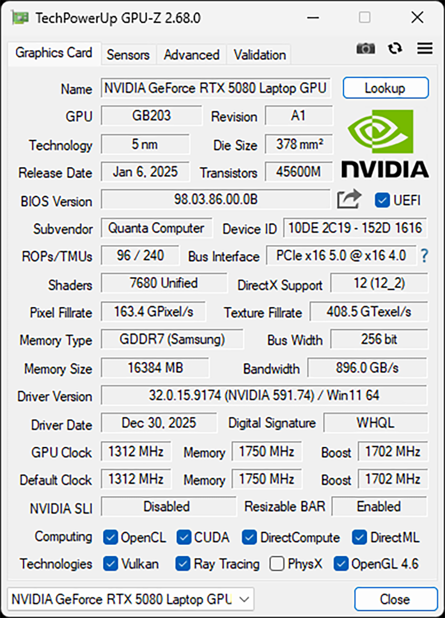 GPU部分,这台MEOW R16 Pro搭载的是英伟达RTX 5080 Laptop显卡,已经属于是非常高端的次旗舰型号了。该显卡采用Blackwell架构,拥有7680个CUDA核心,显存为16GB的GDDR7。有着DLSS 4以及多帧生成技术,对于绝大部分的2K光追游戏来说都是游刃有余,以及Reflex技术,可进一步降低输入延迟,对于FPS竞技类游戏玩家来说尤为合适。同时也非常适合胜任3D模型设计,个人化AI运算等创作需求。