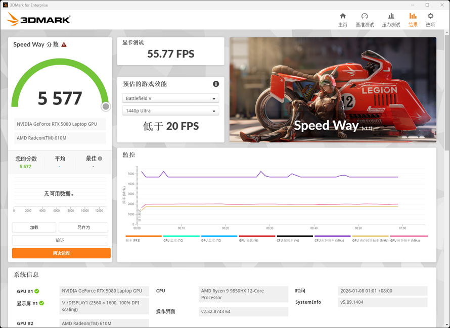 首先来看经典显卡测试软件3DMark,Speed Way项目得分5577,该项目主要考验的是显卡的包括光追在内的混合渲染性能。