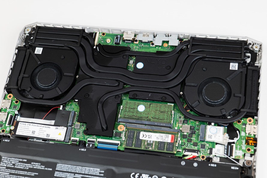 为了应对AMD锐龙9 9850HX处理器以及英伟达RTX 5080 Laptop显卡的发热量,MEOW R16 Pro采用的是双风扇6热管的散热模组,CPU与GPU采用分区导热结构,但其中3根热管为共享设计。