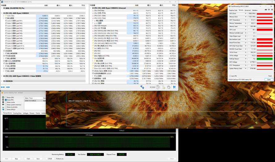 最后再进行CPU+GPU双烤机测试,可以看到CPU功率被限制在了45W左右,CPU温度80.8度,频率为2.743Ghz左右;而显卡则依旧保持173W上下,核心温度为81.5度,核心频率约为1905Mhz。从调度上来说,该款MEOW R16 Pro在CPU+GPU同时负载的情况下选择了牺牲部分CPU性能,主保GPU的满功率运行,从实际角度上来说确实也更加贴近日常游戏中的首要满足显卡满血运行的需求,毕竟CPU在游戏中很难达到完全满载的状态。