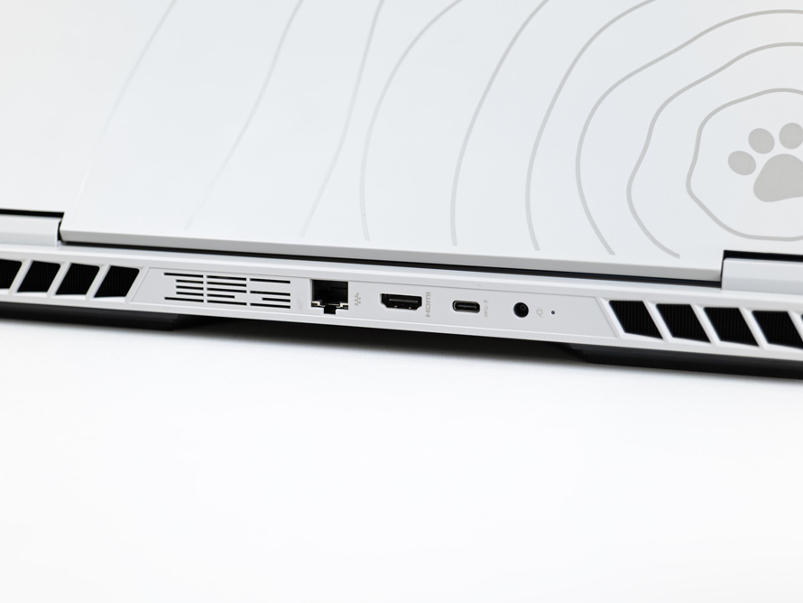接口方面,几个在游戏本上不太会经常插拔的接口被放置在了尾部,分别为一个RJ45 2.5G网口,一个HDMI 2.1接口,一个USB Type-C 10Gbps(支持核显DP 1.4输出,以及PD 140W充电),以及电源的DC接口。