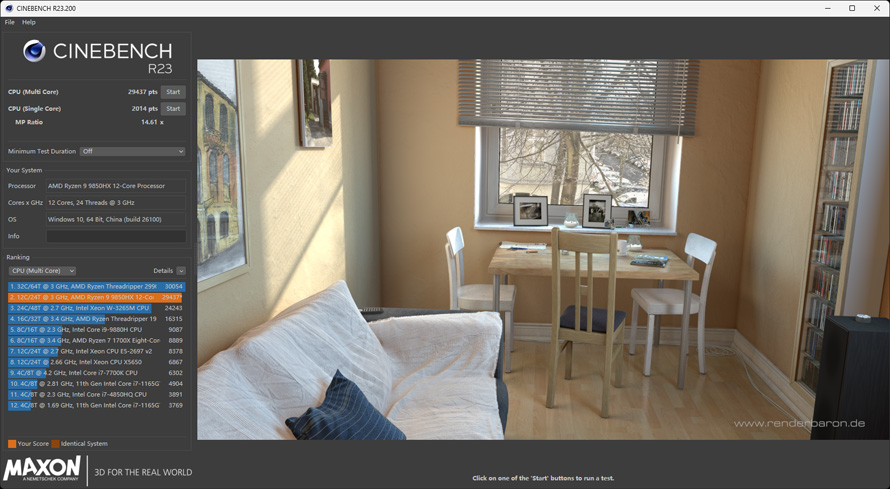 在经典渲染基准软件,CineBench R23中,该CPU多核可获得29437 pts,单核为2014 pts.
