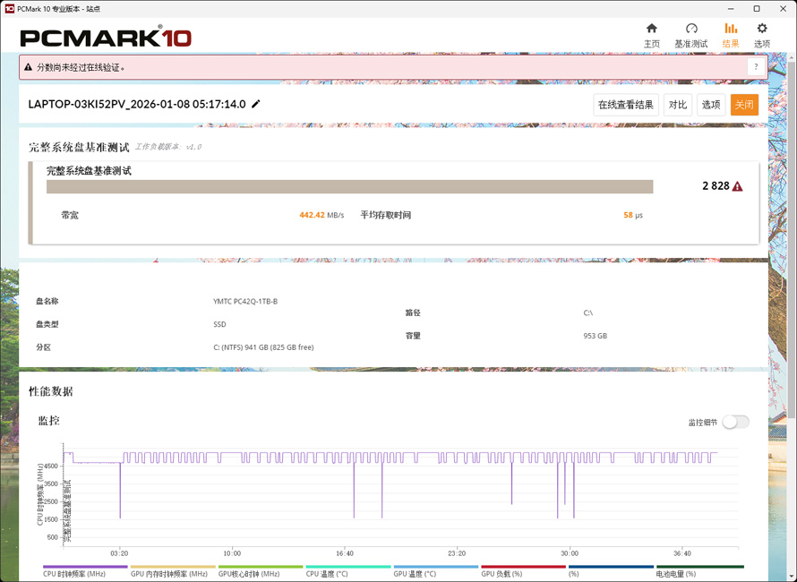 PCMark10完整系统盘测试,得分为2828,带宽442.42 MB/s,平均存取时间为58 us。