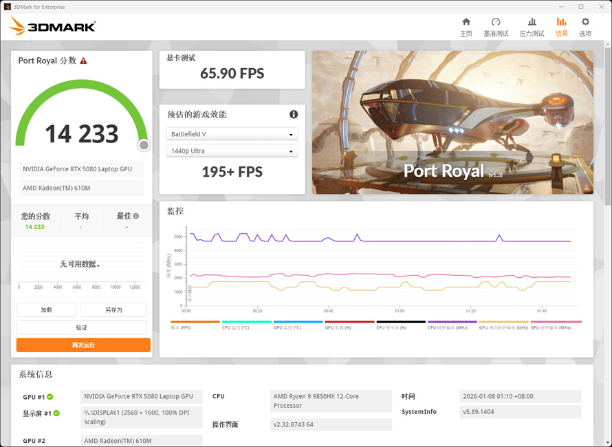 Port Royal项目得分14233,该项目是主要针对显卡的纯光追性能。