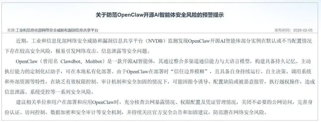 就在全民疯抢养 “虾” 的同时,安全警报也接踵而至。工信部网络安全威胁和漏洞信息共享平台明确指出,OpenClaw 部分实例在默认或不当配置下,极易引发网络攻击、信息泄露,监测显示超 4 万个实例暴露公网,63% 存在可利用漏洞,1.2 万余个可被完全远程控制。且安装需配置 Node.js 和 Git,对普通用户而言无异于给系统开了 “无防护窗口”,加之其部署时 “信任边界模糊”,易被指令诱导、恶意接管,造成系统受控、信息泄露。工信部也支招,部署使用时需核查公网暴露情况、关闭非必要公网访问,完善身份认证、数据加密等安全机制,做好防护再尝鲜。