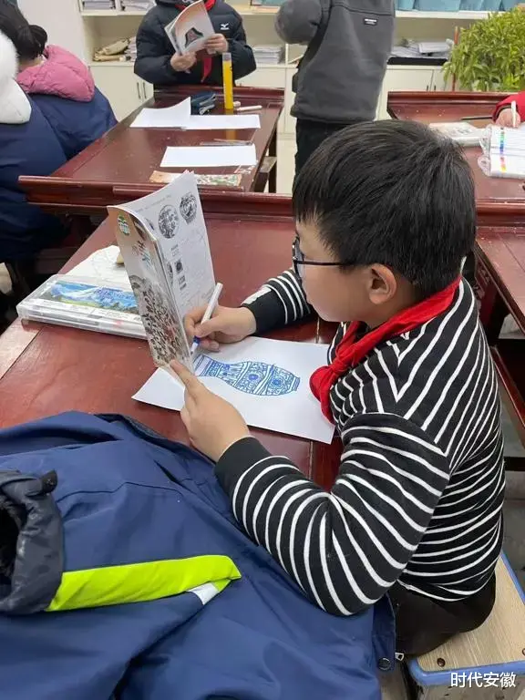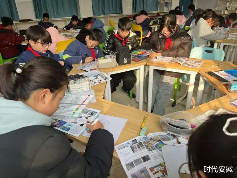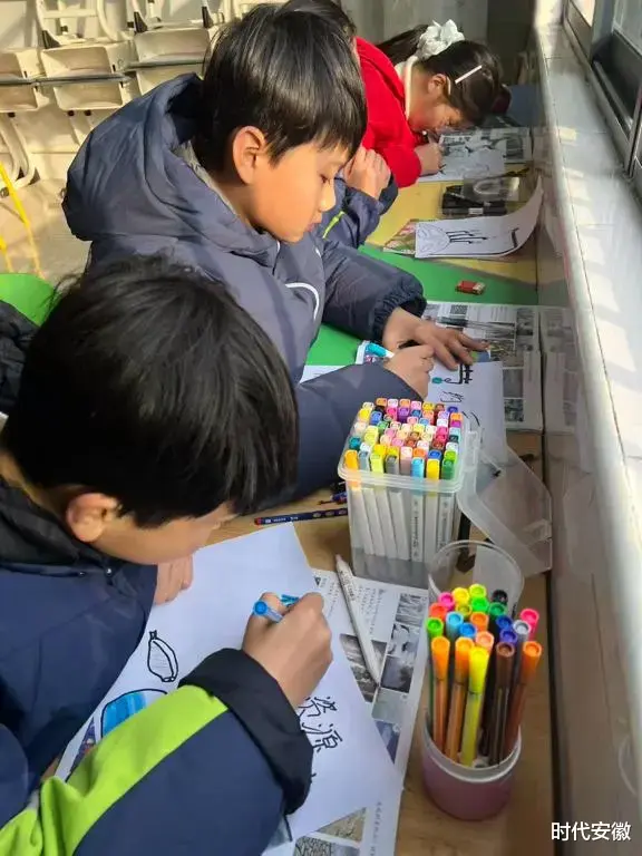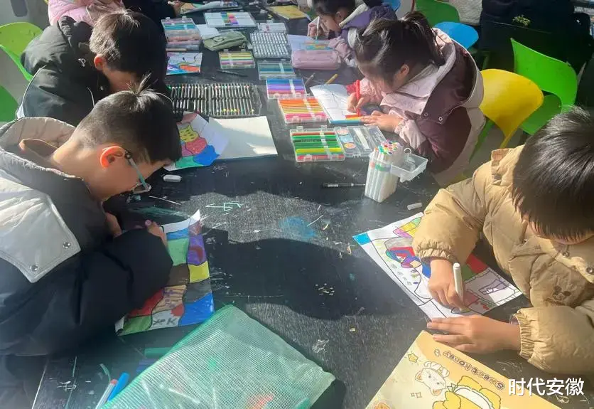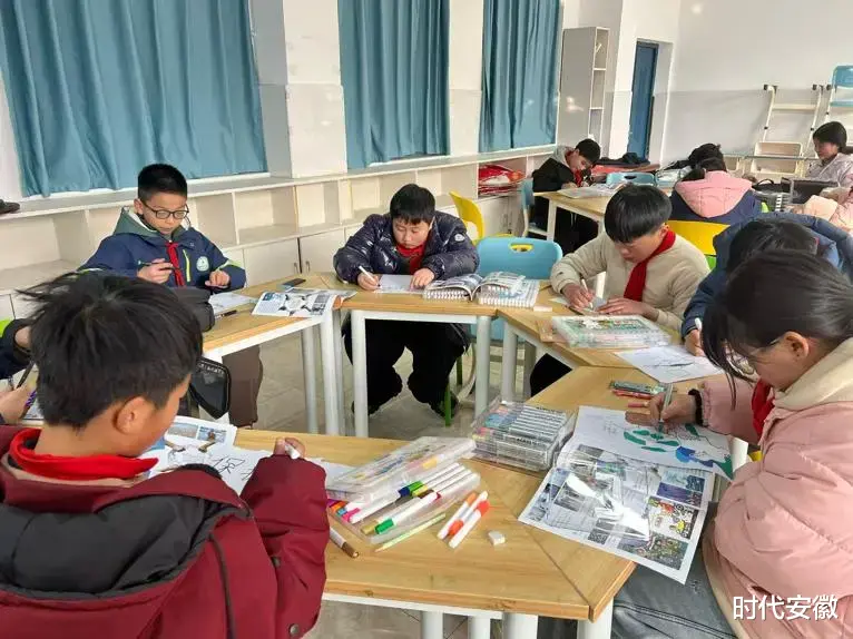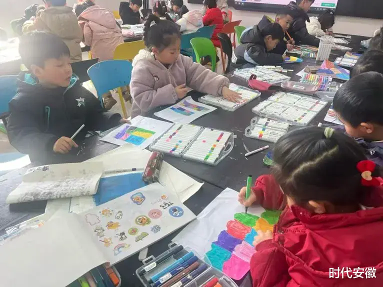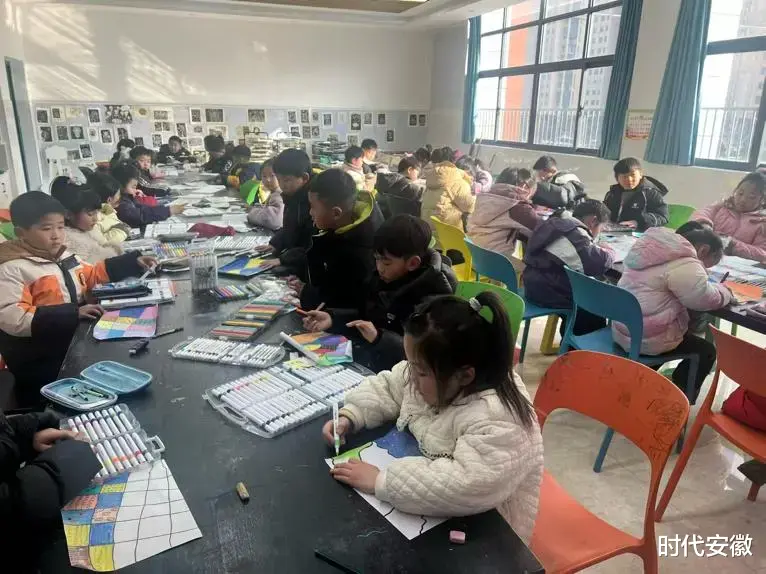 美术教室里,彩笔在小手里流转。孩子们循着课本所学落笔,线条优美,颜色也透着稚气,但每幅画都藏着自己的创作,尽显孩子们的灵气。