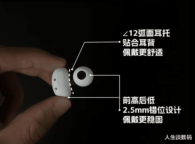 佩戴设计特别贴心,耳机用了 2.5mm 的错位设计,戴在耳朵上是前高后低的样子,特别贴合耳朵形状,戴着特别稳;还有12° 的弧面耳托,把耳机电池那块做成了弧形,能贴紧耳背,舒适度自然也更好;单个耳机才 4.5 克,就算戴好久,耳朵也没啥负担,完全不会有压迫感。