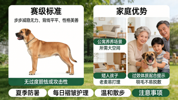 赛级巴哥犬除符合外形标准外,步态需沉稳有力,前后肢协调一致,背线保持水平,性情需友善开朗,无过度胆怯或攻击性。作为家庭伴侣犬,其体型小巧无需大空间,短毛易打理,非常适合公寓饲养,尤其适合老人、上班族及有孩子的家庭。