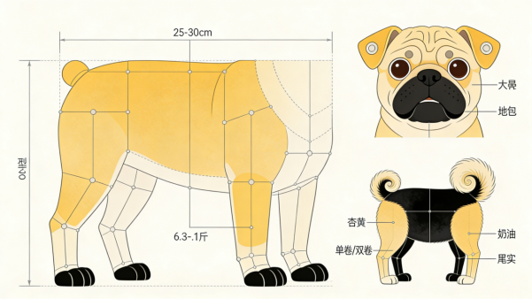 作为小型伴侣犬,巴哥犬身高25-30厘米,体重6.3-8.1千克,身体短而紧凑,胸部宽阔厚实,背部平直短促,骨骼粗壮结实,整体比例呈正方形,行走时步伐稳健如拳击手,故有“拳师犬迷你版”之称。