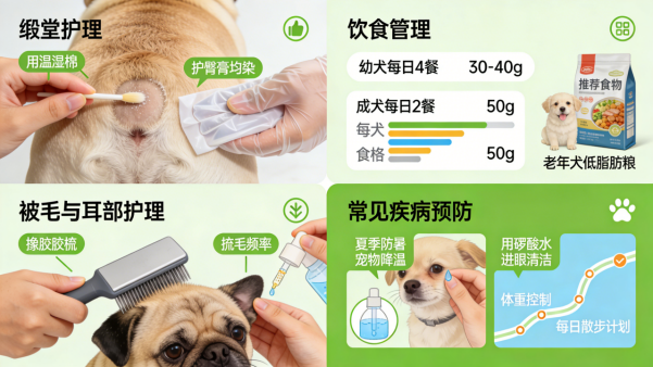 •肥胖相关疾病:严格控制零食摄入,每日进行20分钟温和散步,定期称重,体重超过标准10%需减少喂食量并增加活动量。