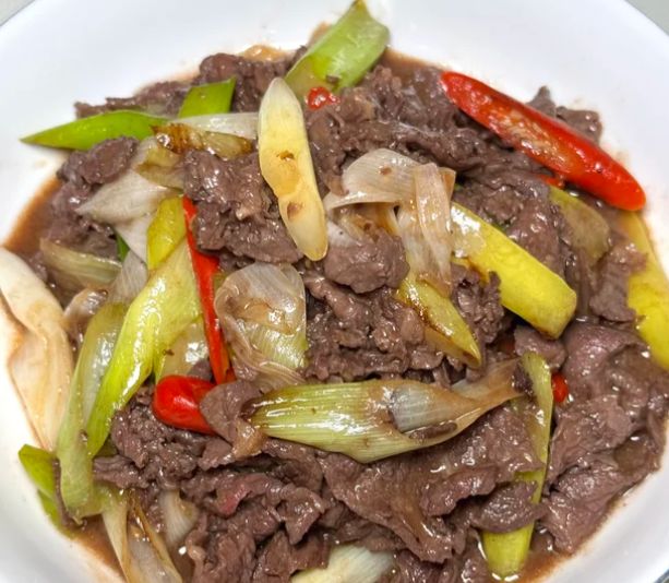 当这盘葱香牛肉端上桌时,葱段依然挺括,牛肉挂着酱色的油汁,热腾腾的蒸汽裹着复合香气直扑人面。夹一筷送入口中,先是葱的清脆甘甜,紧接着是牛肉的嫩滑与干辣椒的焦香,咸鲜之中带着若有若无的辣意,越嚼越有滋味。这菜最适合就着热腾腾的白米饭,让酱色的肉汁缓缓渗入米粒缝隙,一勺饭配一片肉,不知不觉便能让见底的饭碗暴露贪嘴的痕迹。