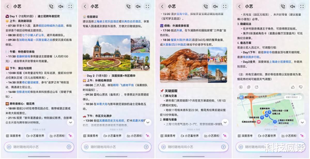 以前做攻略是大海捞针,现在是“张口即来”。只需长按底部导航条唤醒小艺,随口一句:“帮我做一份哈尔滨冰雪大世界的跨年攻略”或者“上海迪士尼跨年攻略”。TA反应极快,几秒钟就能出一份图文并茂的方案,不仅涵盖了必打卡的景点,还包括详细的时间安排和保暖装备清单,甚至连交通指南都能罗列出来。这种“只动嘴不动手”的保姆级服务,直接省去了好几个小时的筛选时间,效率简直高到离谱。