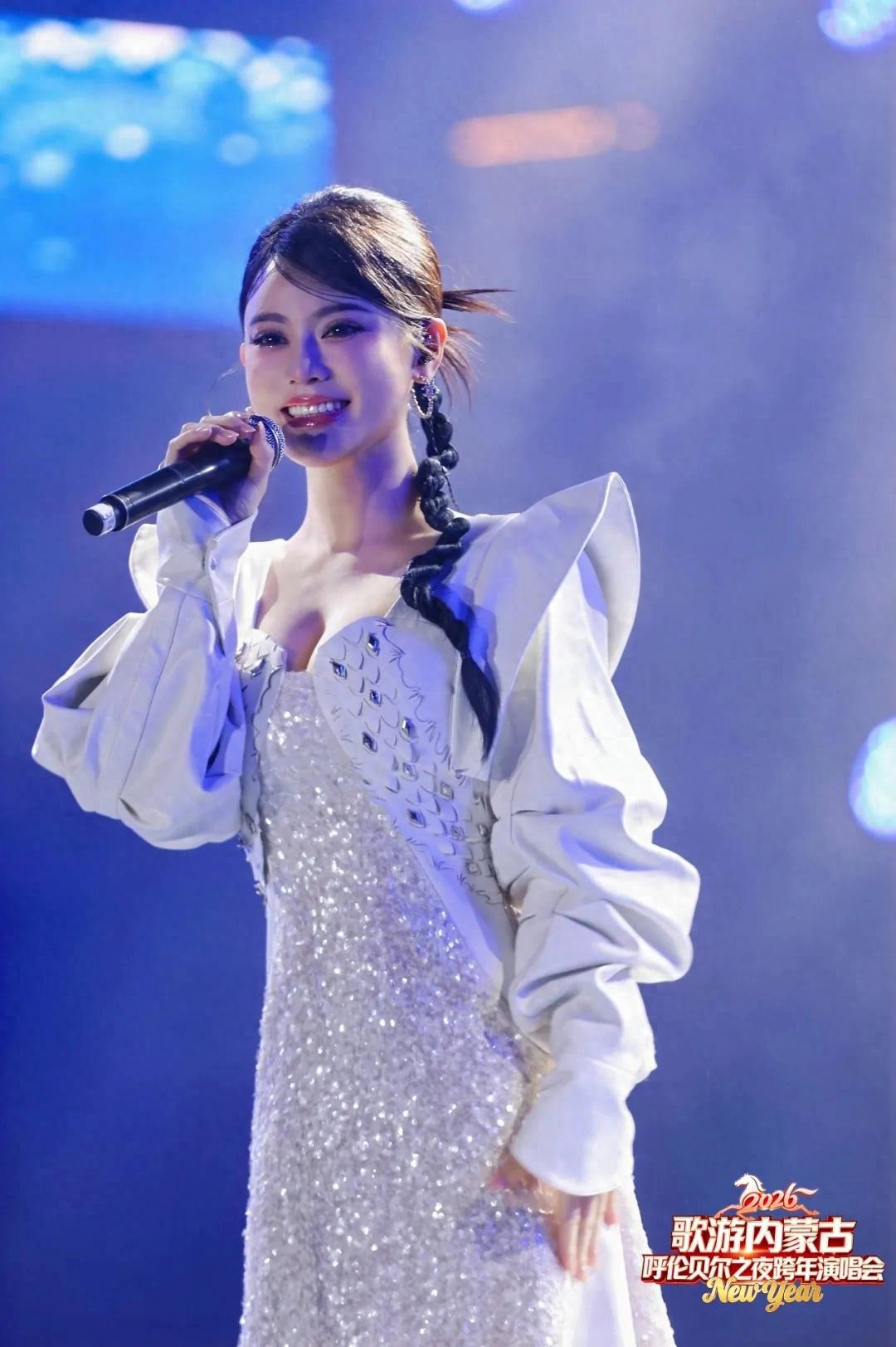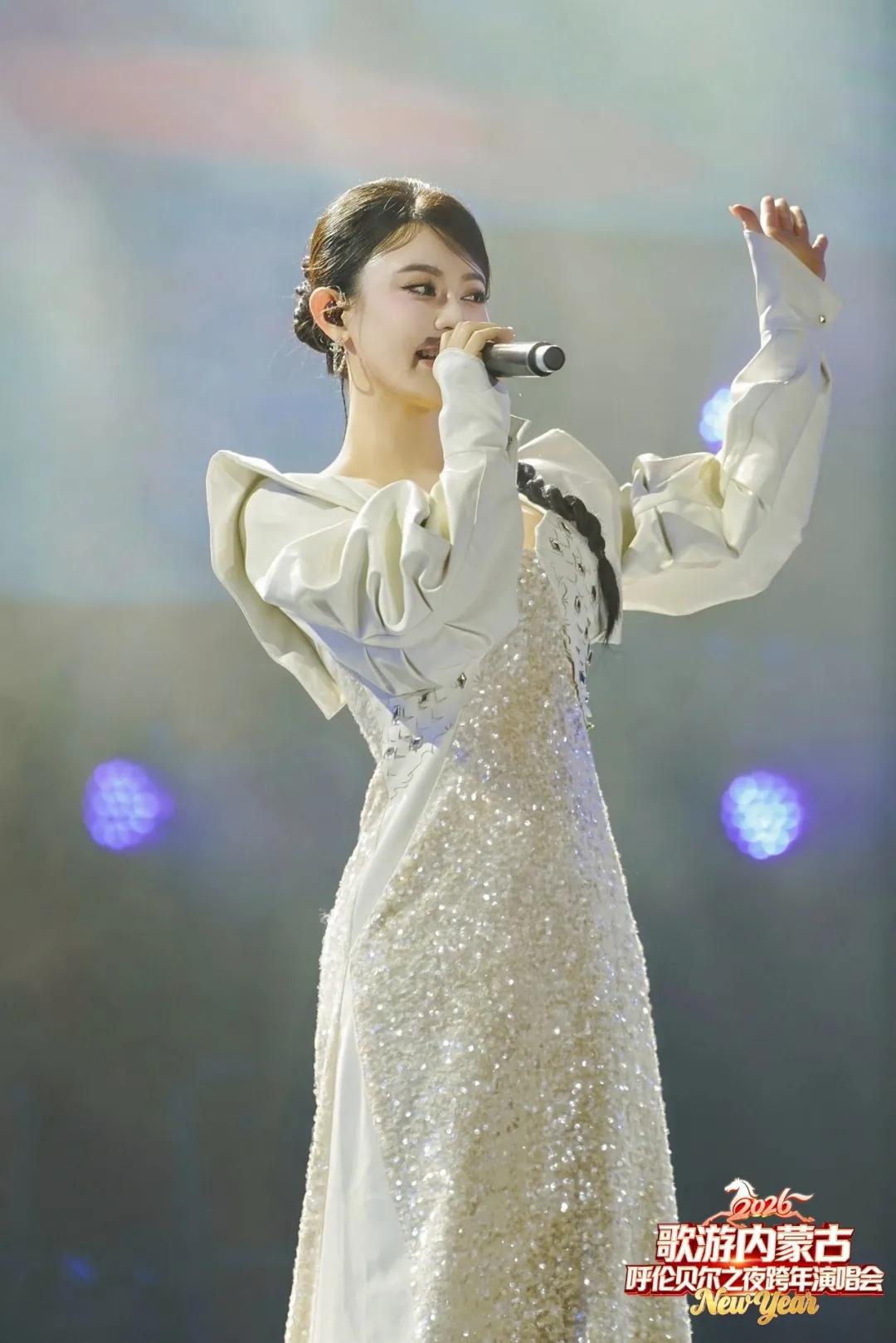 当晚,陈佳妮身着白色细闪长裙礼服登台,与“草原星空”主题的晚会相得益彰,仿佛雪原中走来的歌者。她以一首《蓝天上的云》开场,歌声悠远舒展,与呼伦贝尔辽阔的天地意象共鸣;随后献唱的《愿世间所有的美好如约而至》,则以真挚祝福点燃全场温情,伴随跨年夜的氛围,将晚会推向情感高潮。