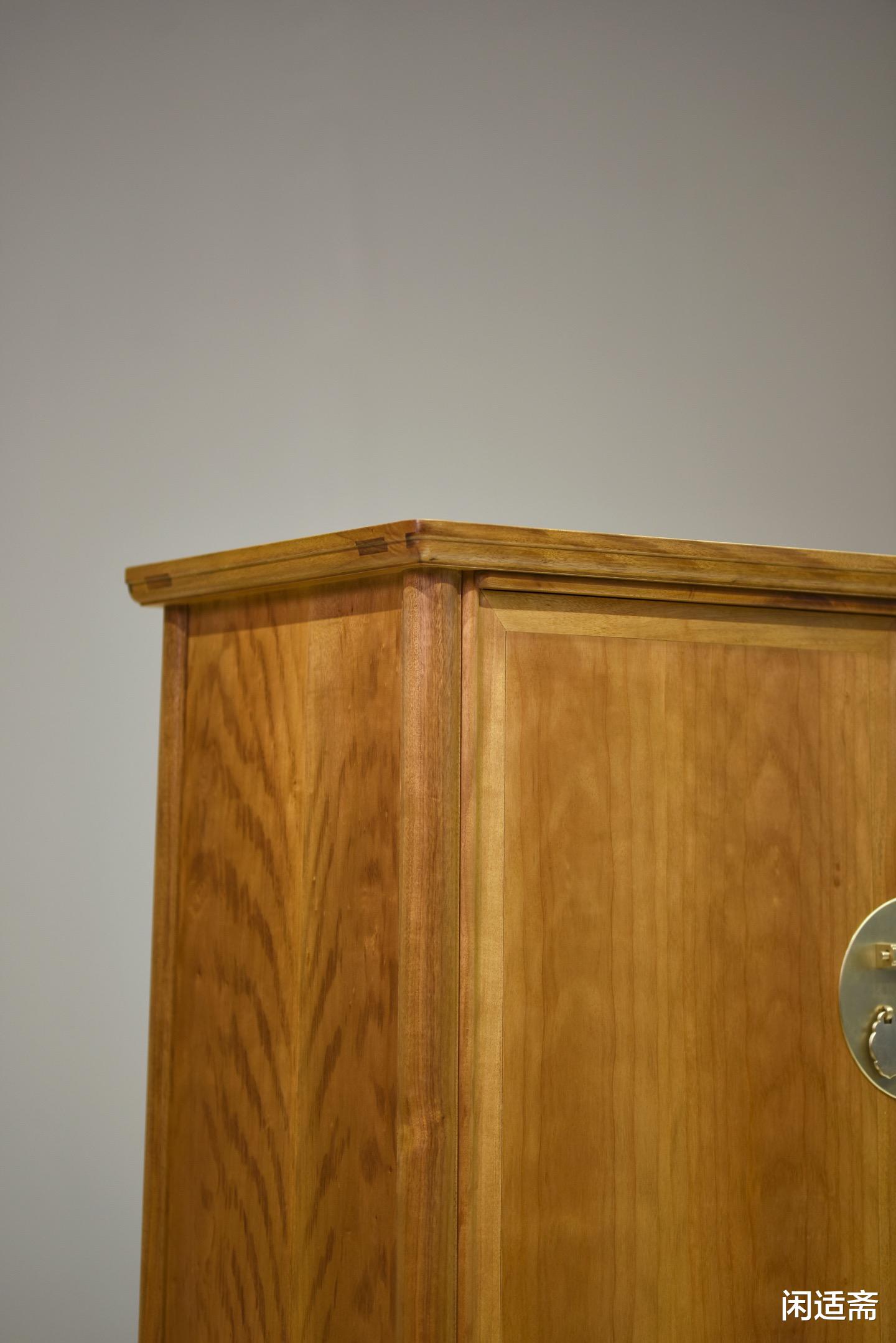工艺上坚守明式木作精髓,全器采用传统榫卯结构攒接,柜角、闩杆、牙条与腿足的衔接严丝合缝,无需一枚铁钉却稳如磐石,历经岁月沉淀仍能保持结构稳固。腿足延续圆角柜经典的侧脚收分设计,微微外张形成“四腿八挓”之势,既增强了柜体稳定性,又让视觉比例更显协调,搭配圆润转角,弱化了方材的生硬感,尽显圆融和谐的中式美学。