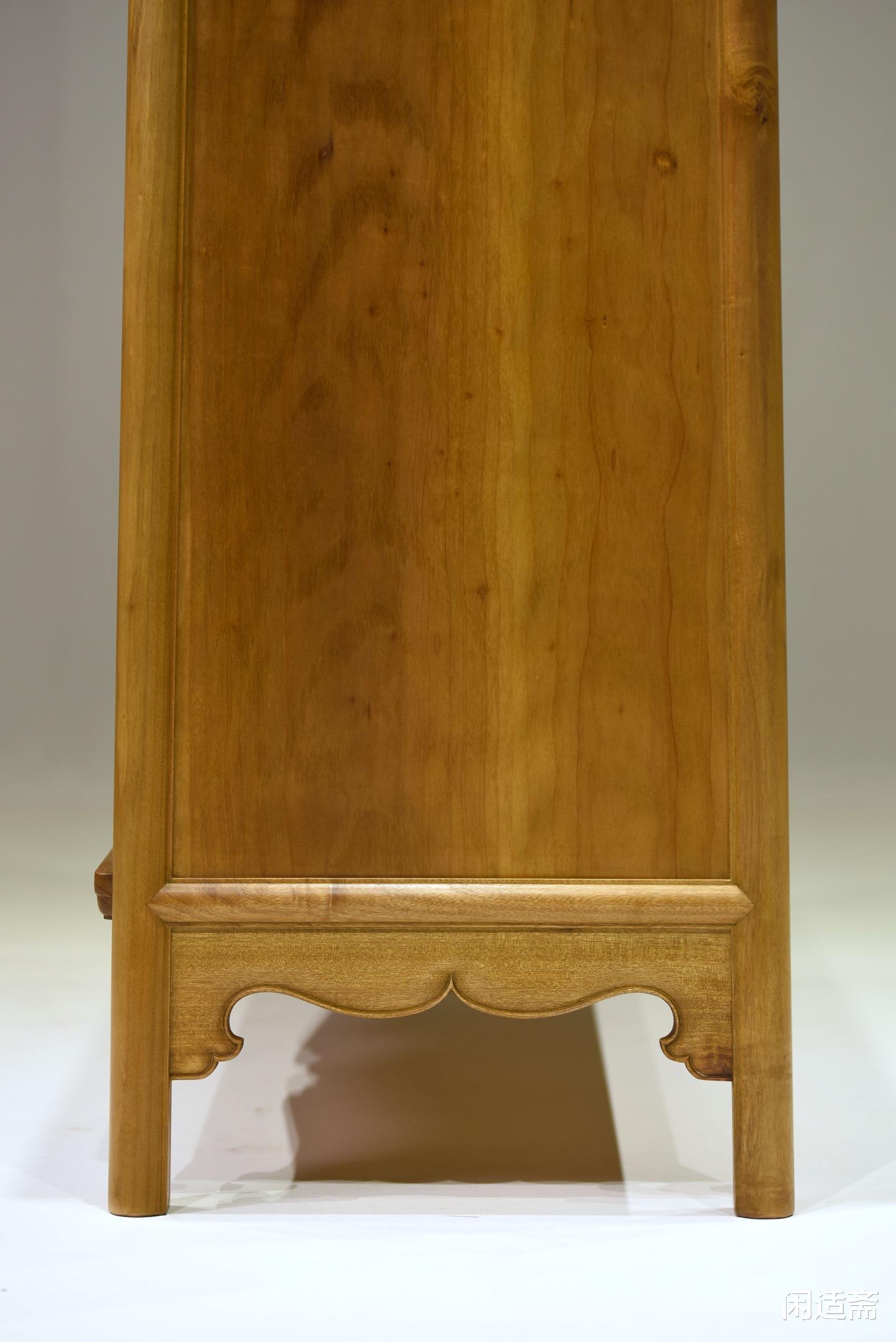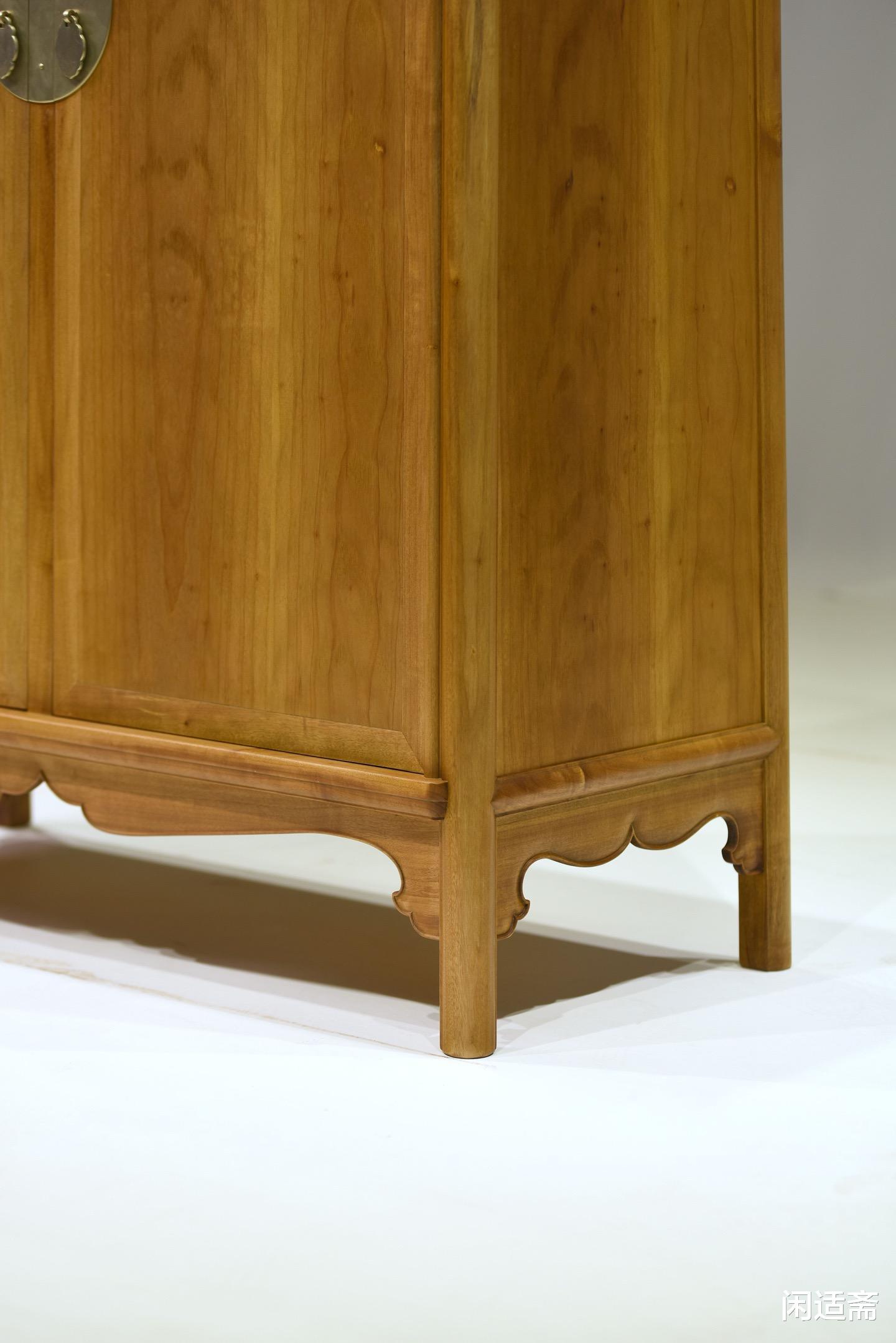 整器装饰仅以足间的三面壶门牙条点缀,堪称点睛之笔。壶门牙条曲线优雅柔美,弧度流畅自然,与小柜朴直方正的整体造型形成巧妙互补,刚健中见柔婉,敦厚中见挺拔,让极简形制瞬间焕发生机。牙条边缘打磨细腻,线条圆润顺滑,无生硬转折,既起到加固腿足衔接、分散承重的实用作用,又以极简装饰平衡了柜体的厚重感,彰显“少即是多”的设计智慧,这也正是此款圆角柜成为经典的核心所在。