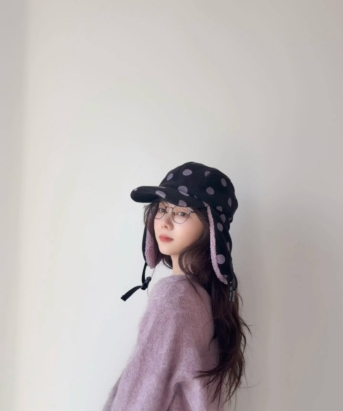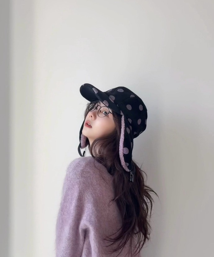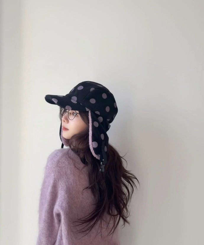 换个人戴,可能就成了东北大碴子味儿。可她一戴,愣是把雷锋帽戴出了法式复古的调调。波点的俏皮,雷锋帽的帅气,加上香芋紫的温柔,三种风格在她身上奇妙地融合在一起。