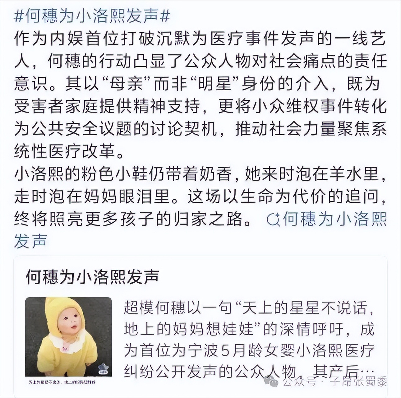 故事的主角除了何穗,还有一位五个月大的小天使小洛熙。这个刚会咿呀学语的宝宝,在一场被承诺“成功率极高”的心脏手术后意外离世,家属维权时不仅遭遇冷遇,还被不明网友网暴。就在大家以为这事要被信息洪流淹没时,今年5月刚升级当妈的何穗,在小红书默默关联话题发声,配文里没喊口号没煽情,却让无数宝妈瞬间破防。
