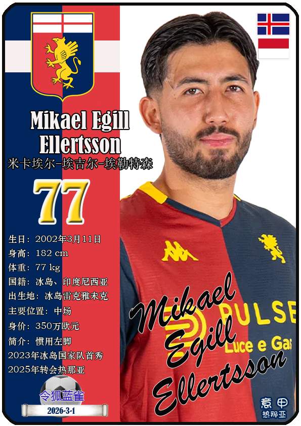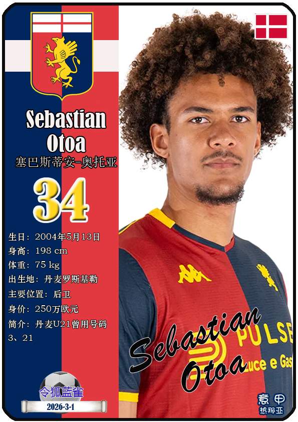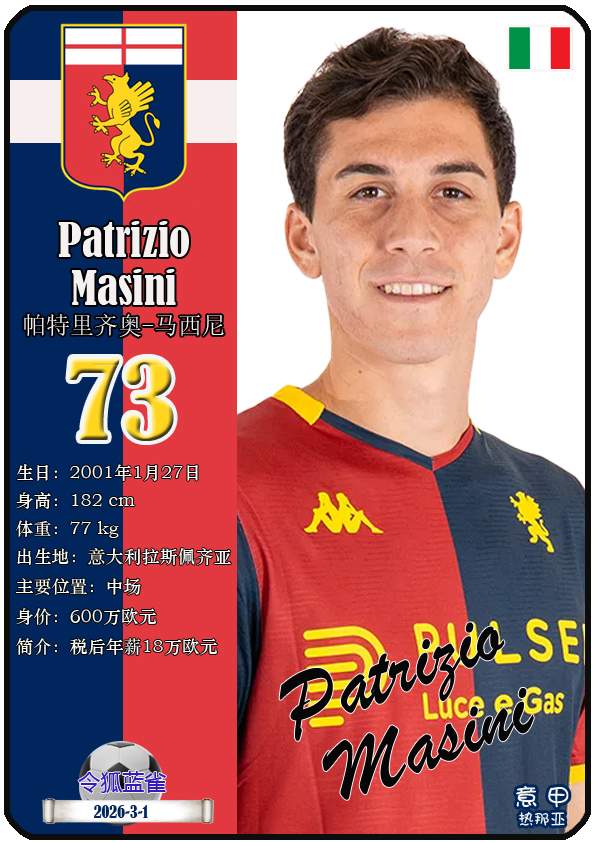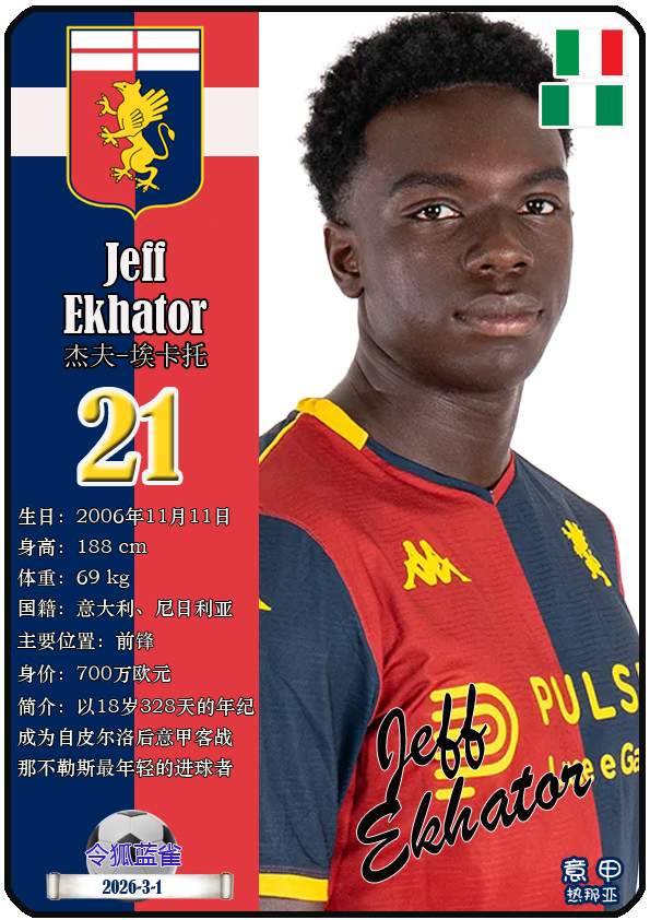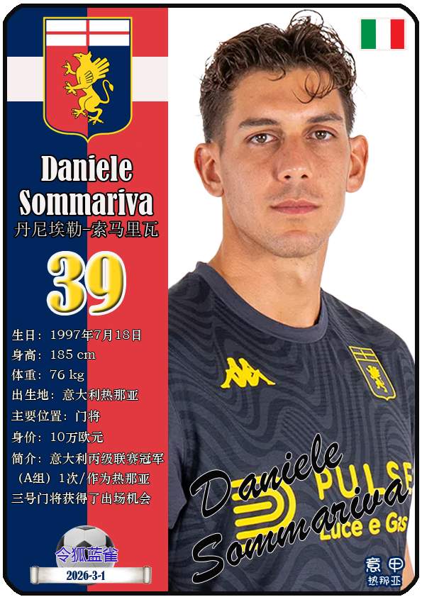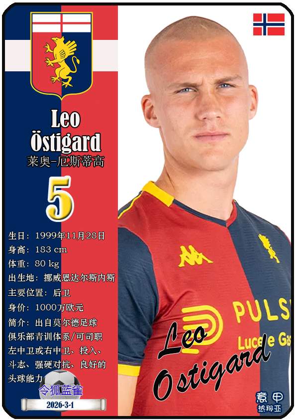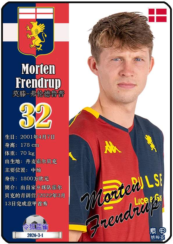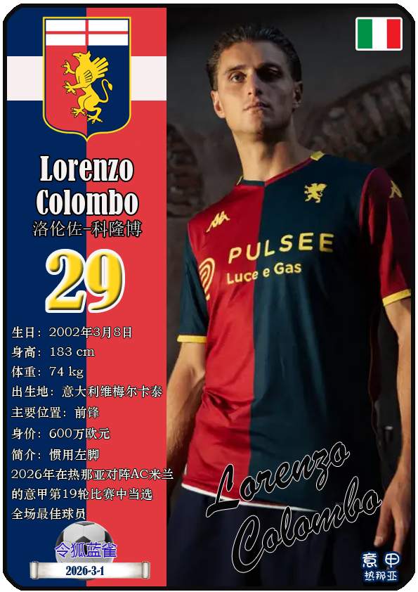 1893年夏天,一群侨居热那亚的英国球迷建立了热那亚足球和板球俱乐部,距今已有133年历史。目前球队主教练是达尼埃莱·德罗西,队内拥有球员沃尔特-朱尼尔-梅西亚斯、维克托-维蒂尼亚、米卡埃尔-埃吉尔-埃勒特森等。本期以球星卡的形式展示截至2026年3月1日意甲热那亚足球俱乐部的23名球员(按球衣号码排序):