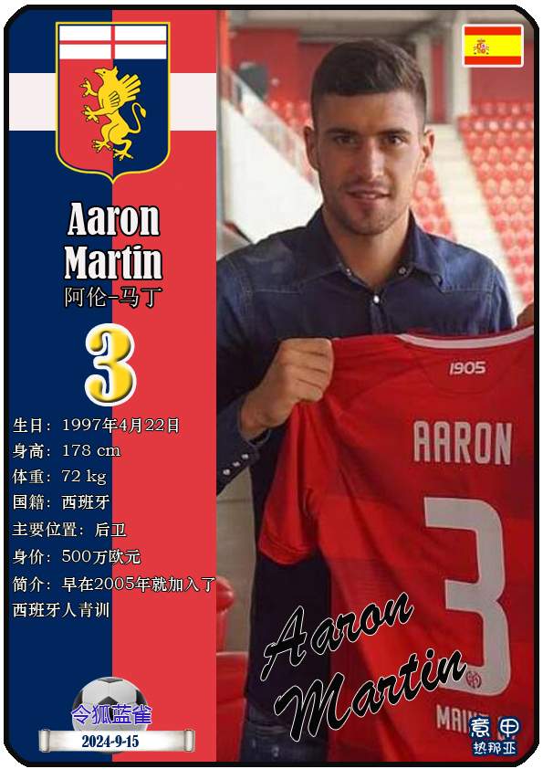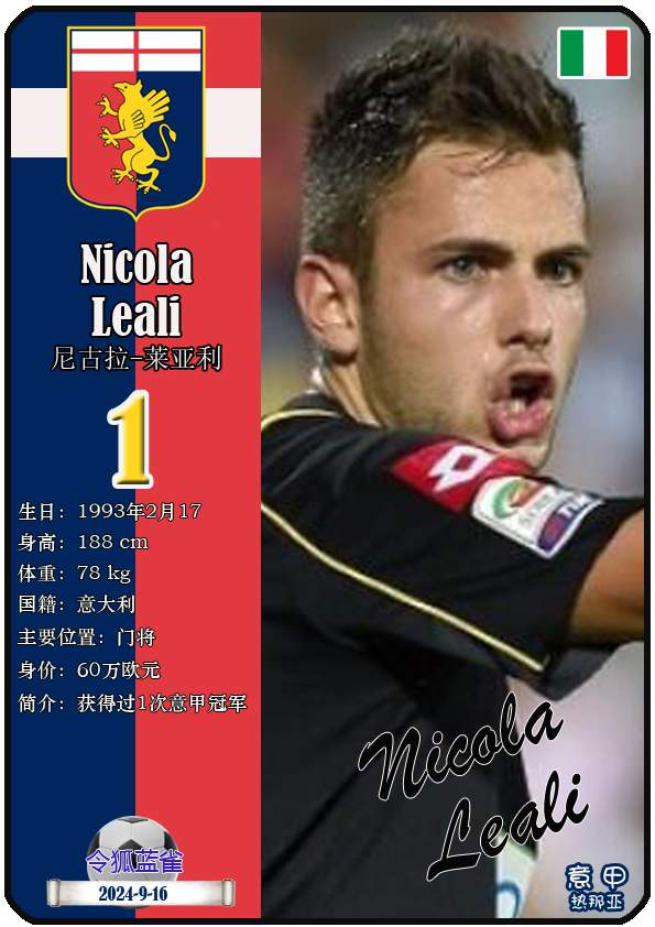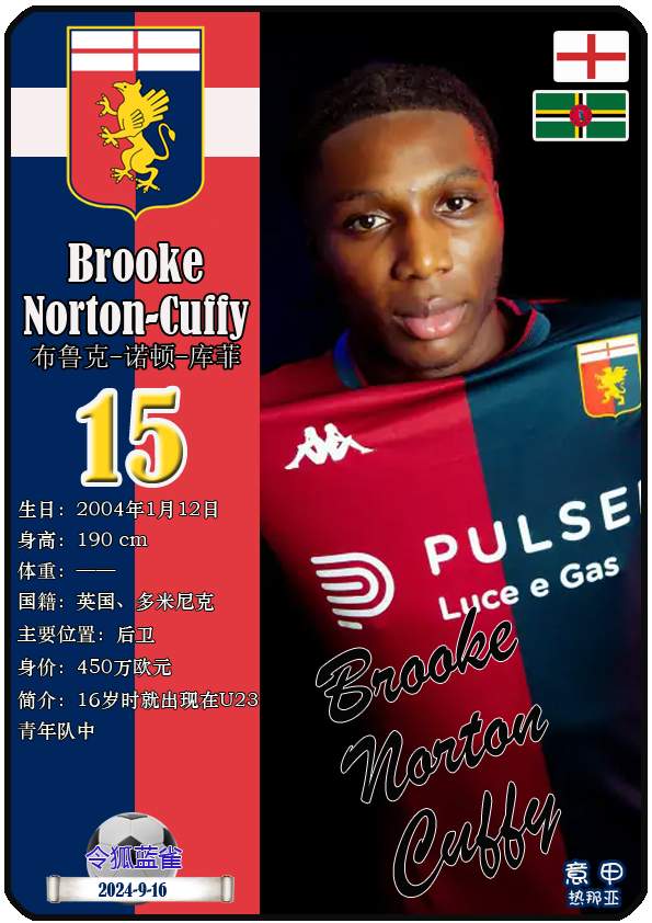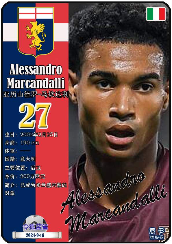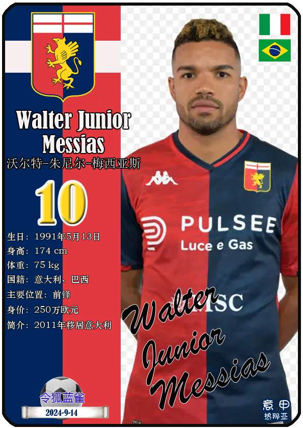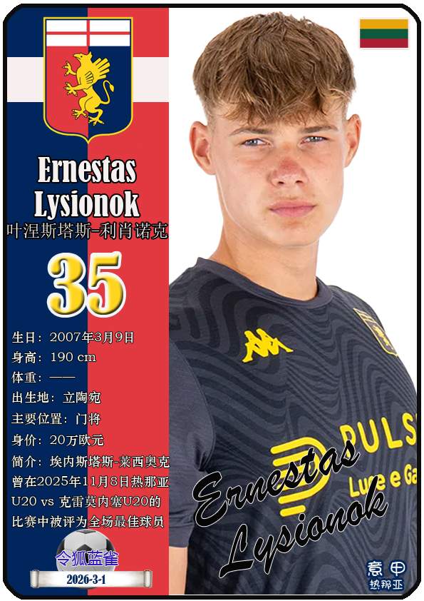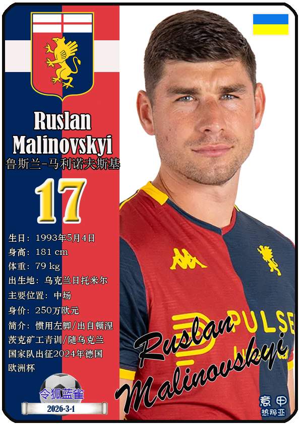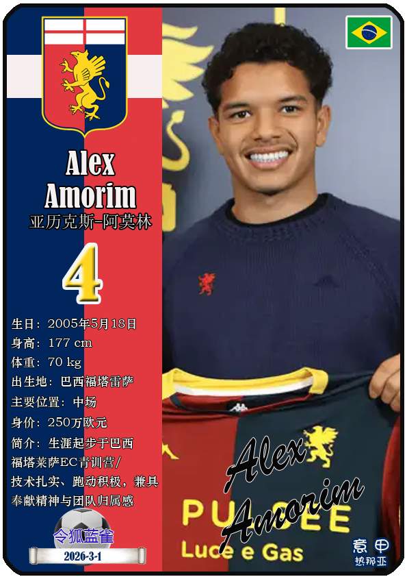 1893年夏天,一群侨居热那亚的英国球迷建立了热那亚足球和板球俱乐部,距今已有133年历史。目前球队主教练是达尼埃莱·德罗西,队内拥有球员沃尔特-朱尼尔-梅西亚斯、维克托-维蒂尼亚、米卡埃尔-埃吉尔-埃勒特森等。本期以球星卡的形式展示截至2026年3月1日意甲热那亚足球俱乐部的23名球员(按球衣号码排序):